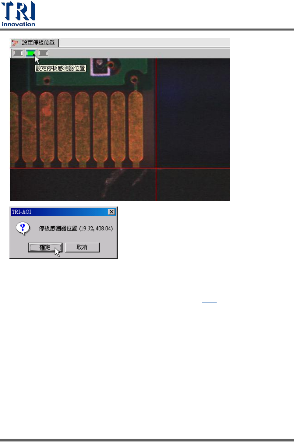影機移動至電路板之左下角位置,接著按下 按鈕,設定停板感測器位置。