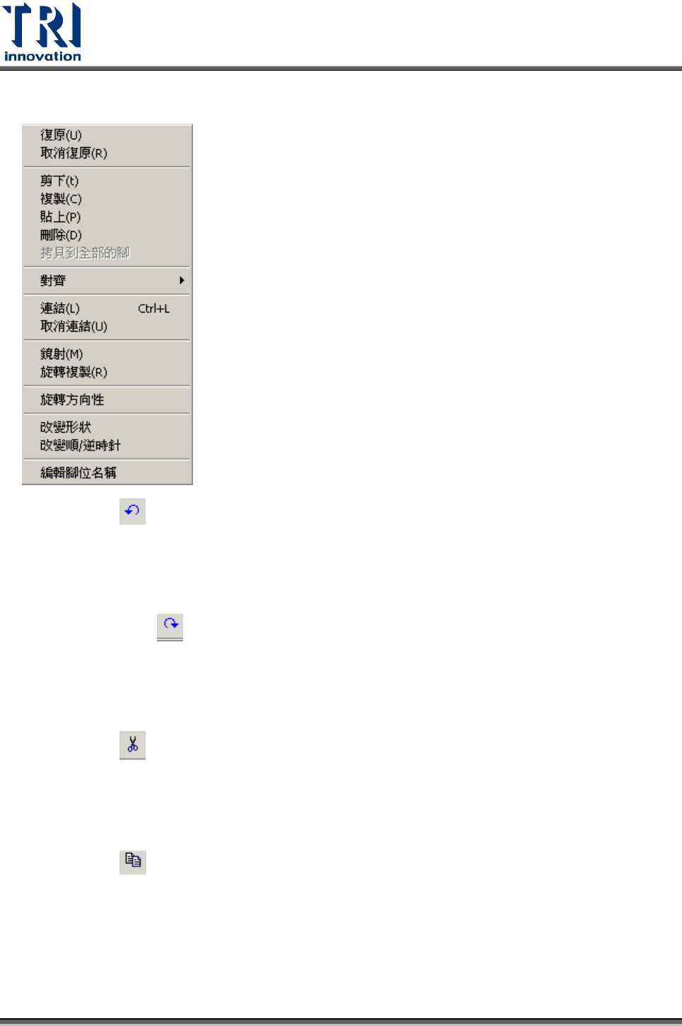 Test Research Inc. TR 7700 S II User Guid e – Softwar e 317 4.9.3 編輯 4.9.3.1 復原 返回前一個動作。 4.9.3.2 取消復原 重作上一個動作。 4.9.3.3 剪下 將所選擇的框剪下。 4.9.3.4 複製 將所選擇的框複製。