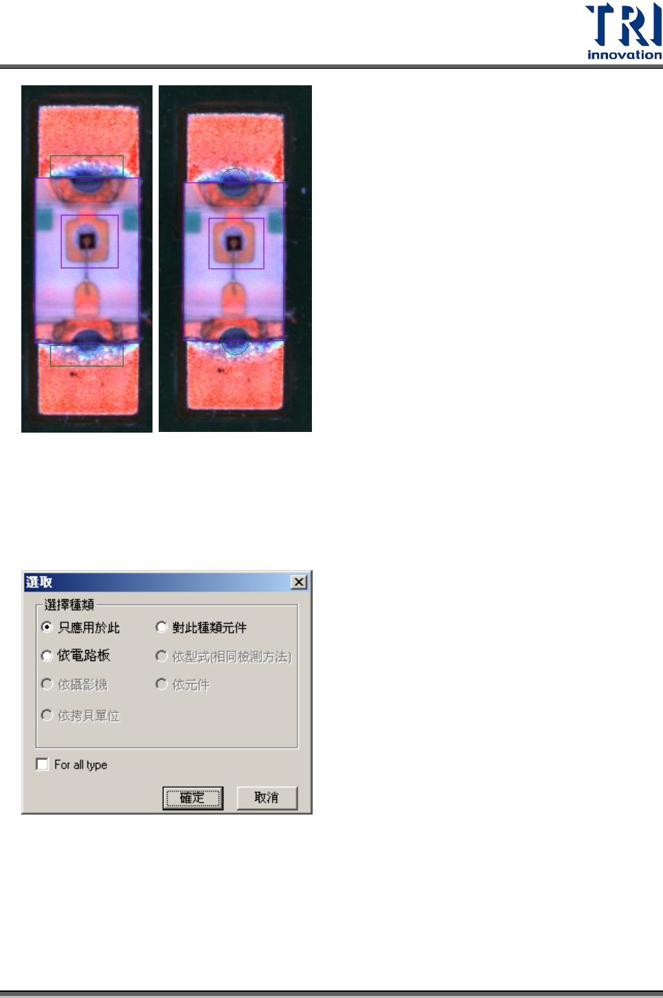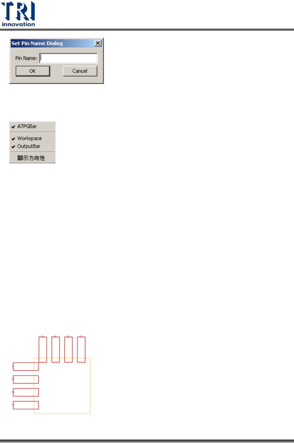 Test Research Inc. TR 7700 S II User Guid e – Softwar e 323 4.9.4 檢視 4.9.4.1 ATPGBar 顯示 ATPGBar 功能列。 4.9.4.2 Workspace 顯示左方元件類型工作區域。 4.9.4.3 OutputBar 顯示下方的輸出控制區域。 4.9.4.4 顯示方向性 開啟本功能以小圓圈來表示腳位的方向性。正常的方向性如下圖所示,若方向錯誤, 需要按 …