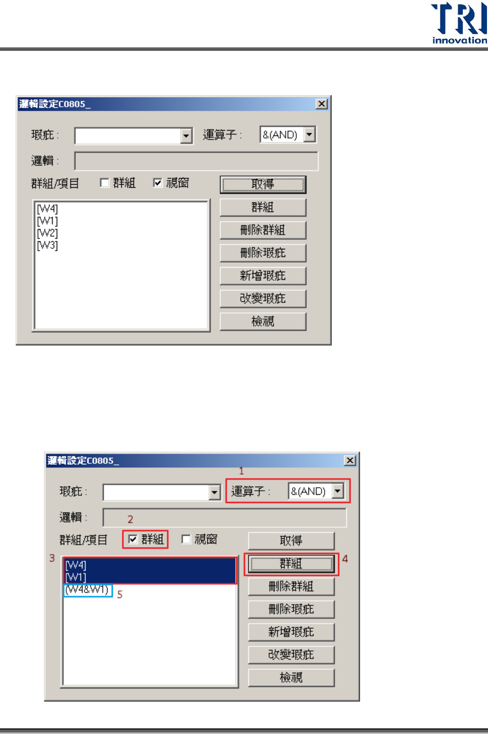 的檢測框(2) 選擇想要的邏輯方式(3)勾選[視窗](4)點選[群組]按鈕(5)系統會把邏