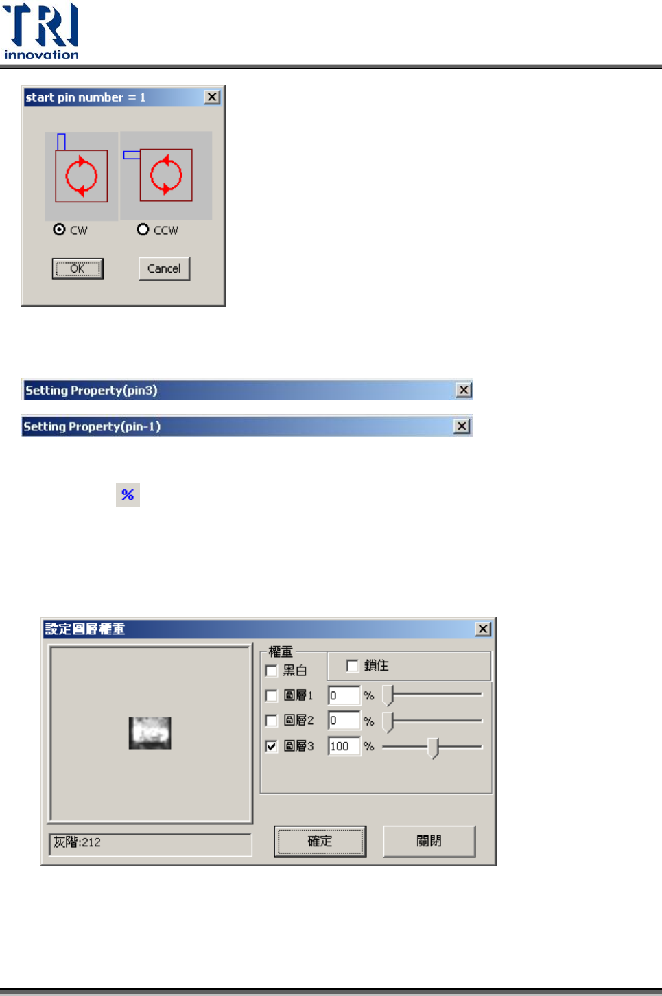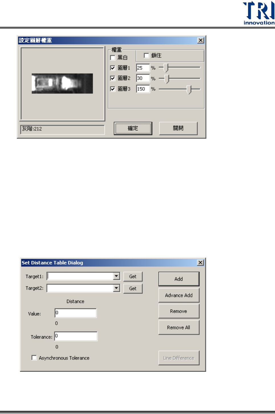 Test Research Inc. 364 TR 7700 S II User Guid e – Softwar e 4.9.8.9 設定遮罩 設定影像的遮罩。此功能已經修改至在屬性設定欄內使用。 4.9.8.10 邏輯設定 提供點對點、點對線、線對線和 Light Bar 平整度的量測。 設定界面 測量二個元件的距離的設定界面 測量元件到邊或邊到邊的距的的設定界面
