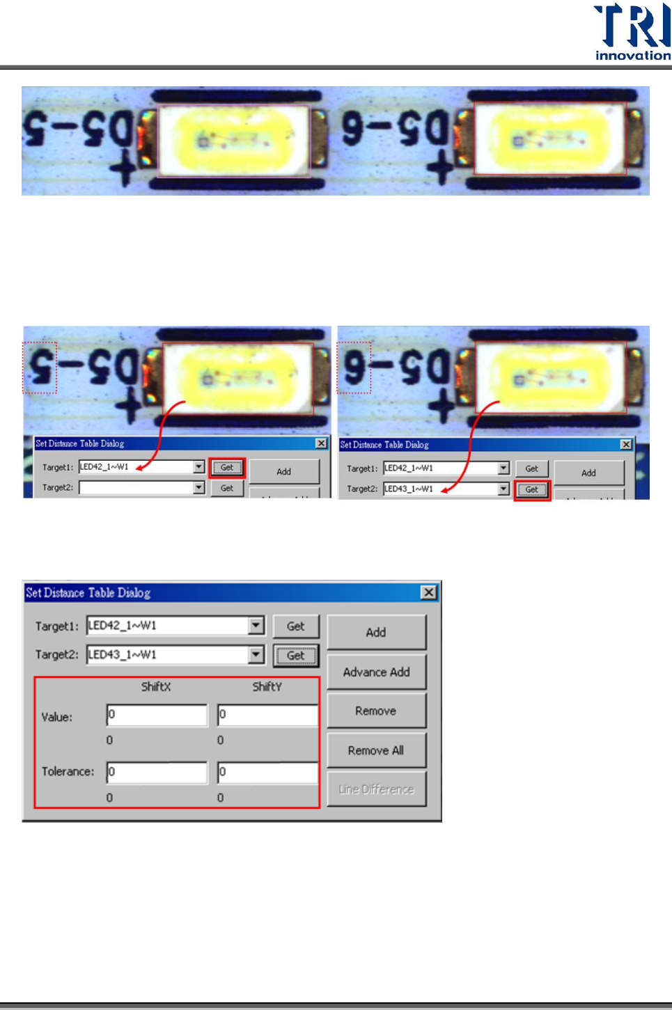 Test Research Inc. TR 7700 S II User Guid e – Softwar e 369 檢測結果的顯示 檢測結果在 Result Tre e 以 [Target1] 作為顯示的元件名稱。 並將檢測結果存在 [* .pfl] 檔內傳至 SPC 。 4.9.9 工具列 4.9.9.1 連結 顯示出目前所選取的檢測框與其他檢測框的連結關係,以亮藍色線條表示。