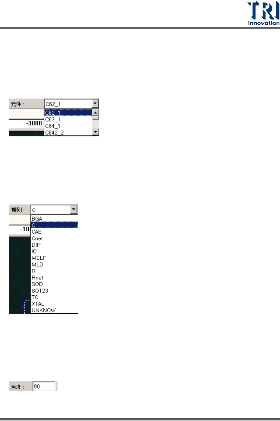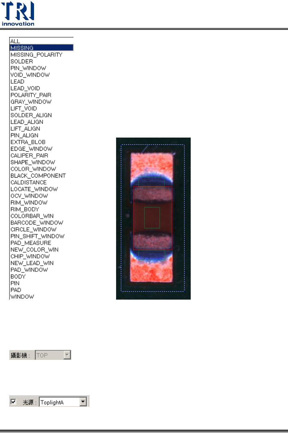 Test Research Inc. TR 7700 S II User Guid e – Softwar e 371 4.9.9.4 攝影機 在此選項中僅有 TOP 一個選項。代表是目前所使用的是上方的攝影機。 4.9.9.5 光源