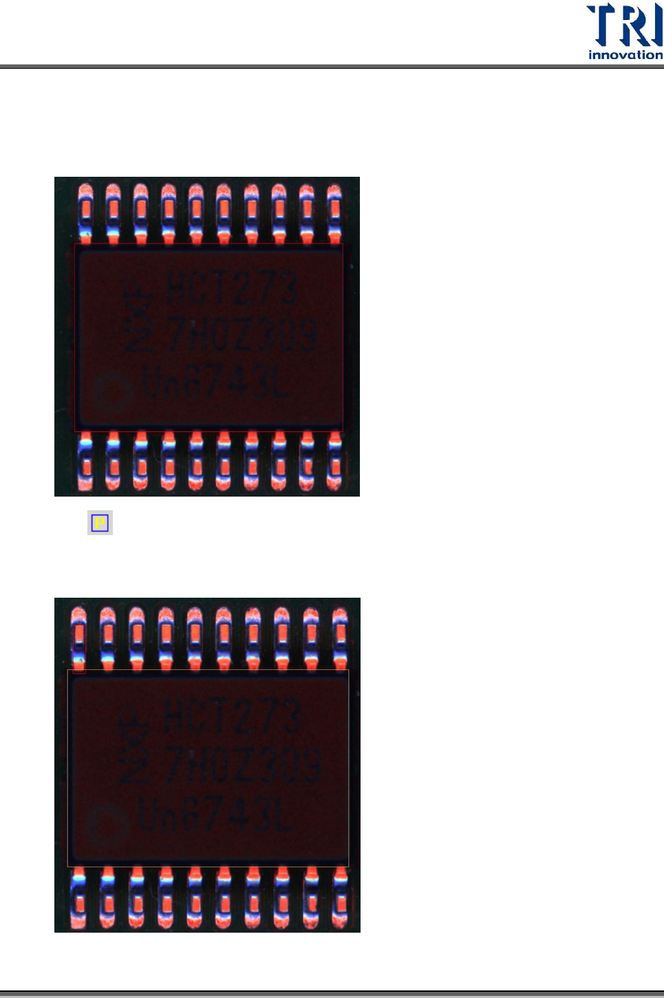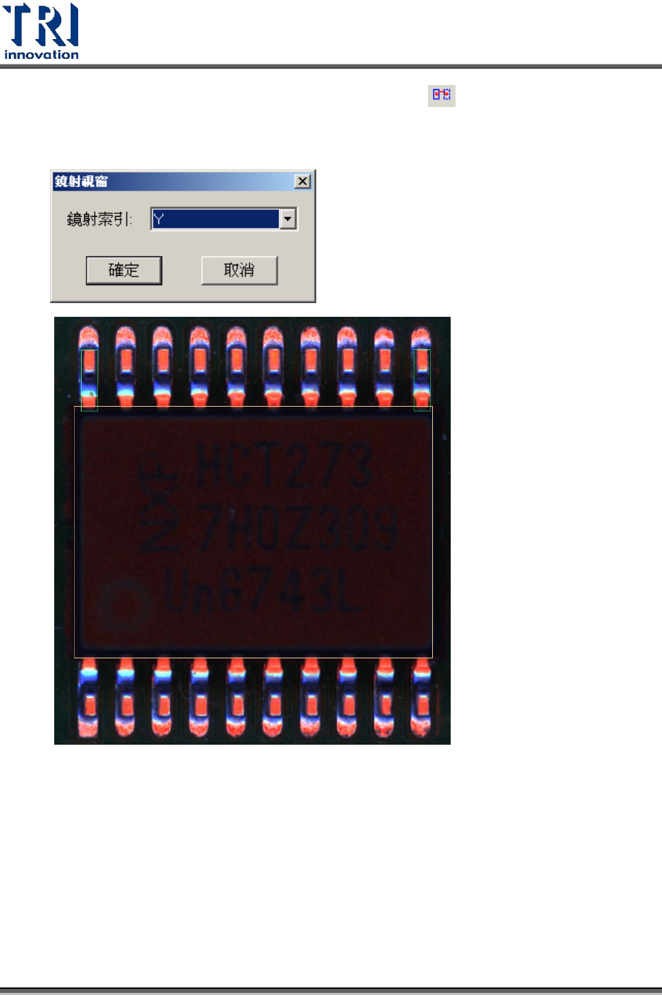 Test Research Inc. TR 7700 S II User Guid e – Softwar e 381 3) 在影像中點選新增的腳位 (PIN) 框後,按下 鏡射 按鈕 ( ) 。依範例的元件,須依 據 Y 軸進行鏡射,將此檢測框複製到元件的另一端。如果複製出來的腳位框位置 不對,使用者須自行拖曳到正確的腳位位置。