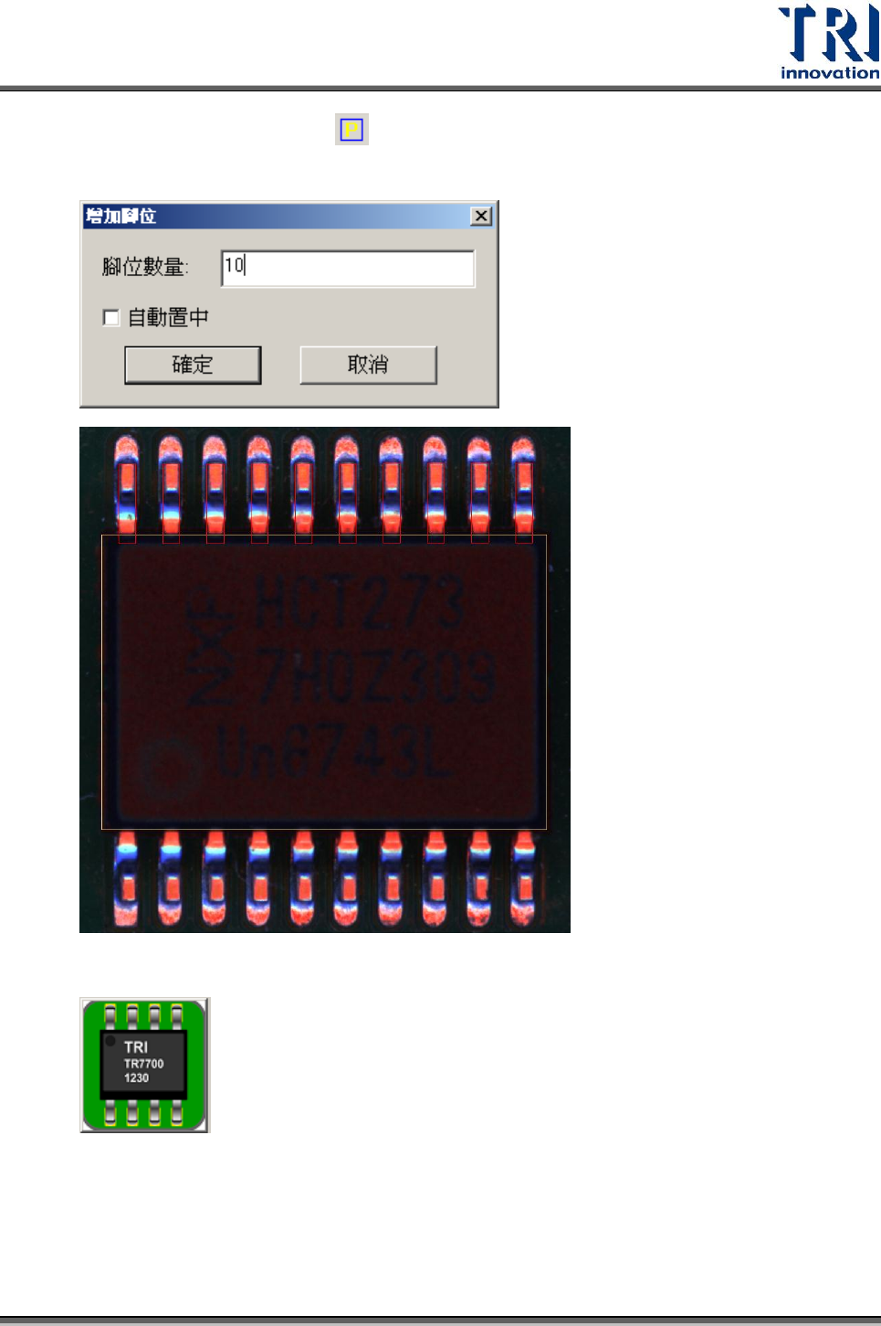 Test Research Inc. TR 7700 S II User Guid e – Softwar e 383 6) 系統會依照 IC 腳的位置,自動產生檢測框,如下圖所示。若有比下圖多出的檢測 框,使用者可根據實際元件狀況,自行選擇保留會刪除。圖示中為最基本所需要 的檢測框。 ( 元件上會有一個 [Missing] 框,每支 IC 腳上,會有 [Lead] 框、 [Void] 框 以及 [Solder] 框。 ) 7) 對於所…