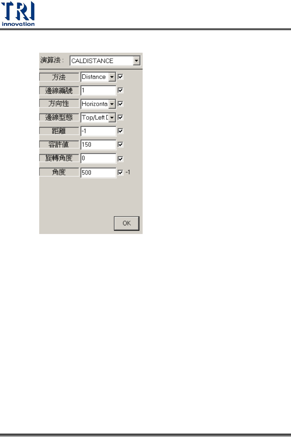 Test Research Inc. 406 TR 7700 S II User Guid e – Softwar e 4.10.2.14 CalDistance 用來檢測元件部分區域的距離或者角度。可選擇兩種方法進行, [Distance] 或 [Angle] 。 選擇 [Distance] ,可量測兩個一組的檢測框的邊距;選擇 [Angle] ,可量測單一檢測框 內所找到邊的角度。 1. Distance 以成對的檢測框來檢測兩個邊…