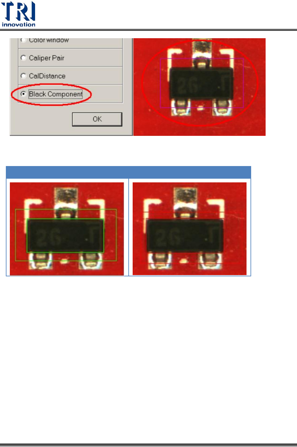 本檢測框主要用來檢測表面上無特徵點的黑色元件,其偏移或缺件的狀況。