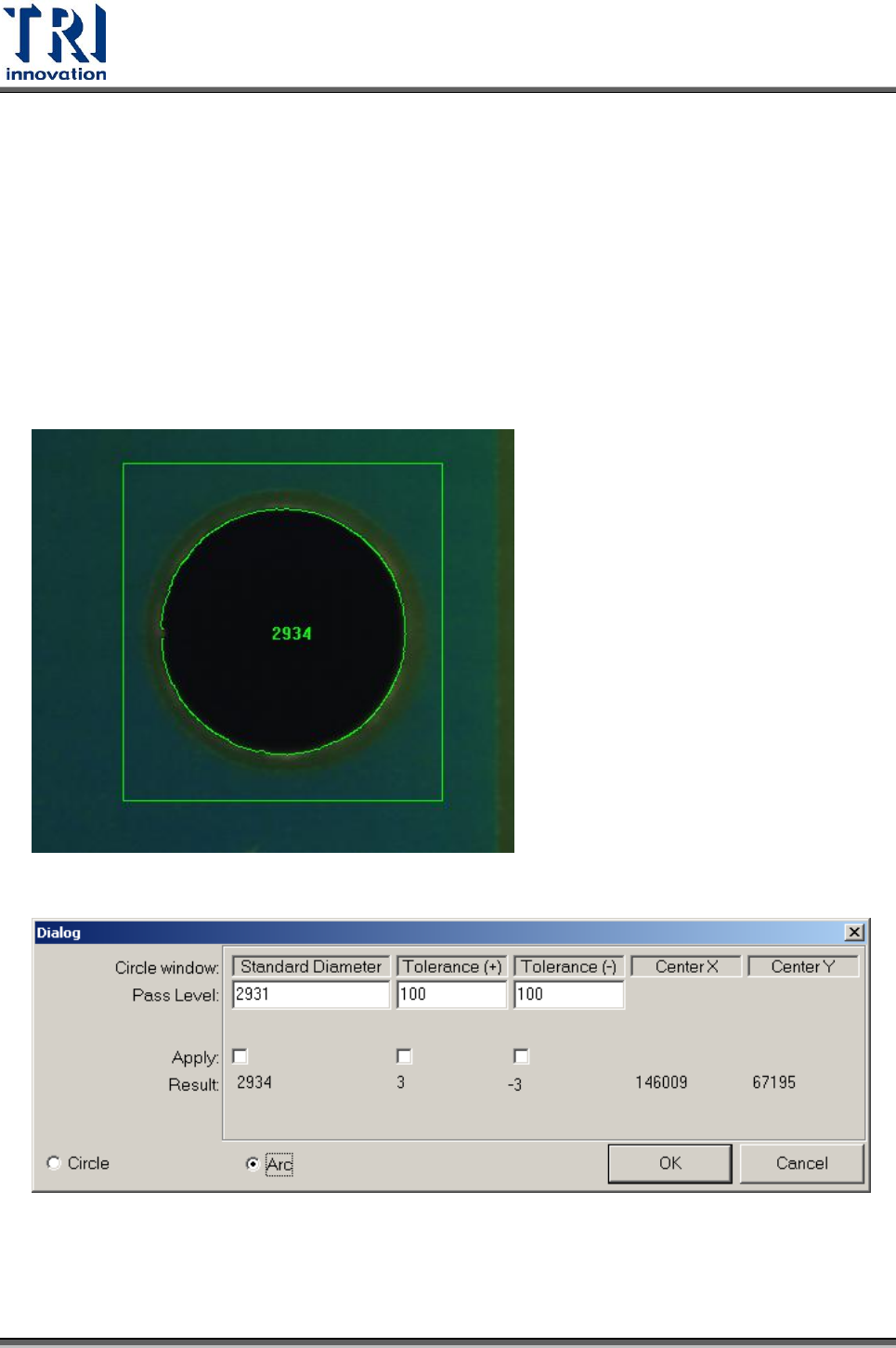 Test Research Inc. 414 TR 7700 S II User Guid e – Softwar e Tolarance(+) : 直徑 變化正容許值,單位為 micron 。 Tolarance(-) : 直徑 變化負容許值,單位為 micron 。 Center X :圓心 CAD X 座標,單位為 micron 。 Center Y :圓心 CAD Y 座標,單位為 micron 。 4.10.2.18 Colo…