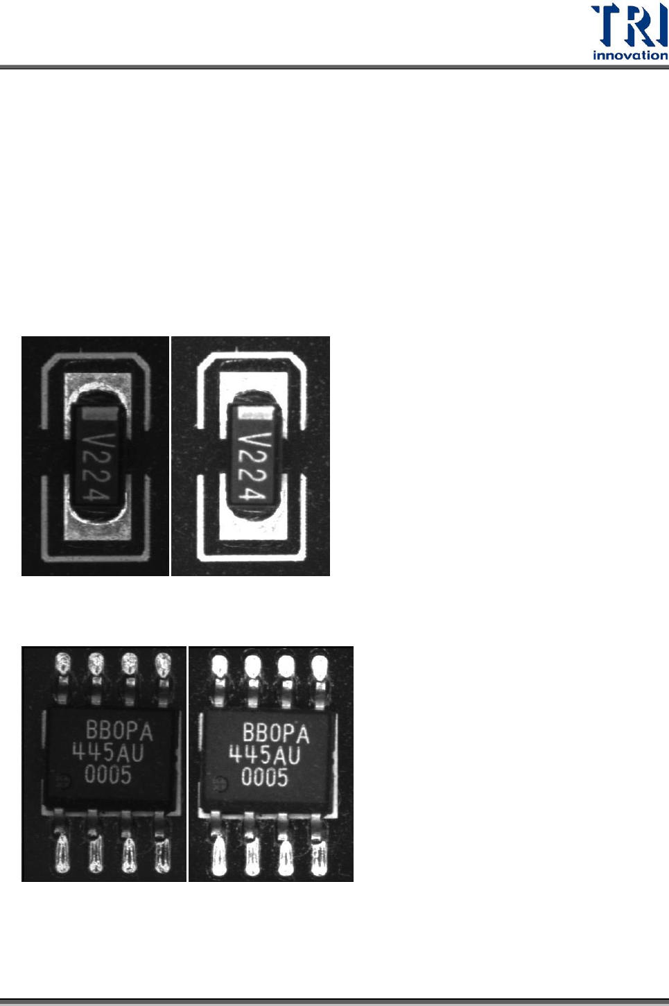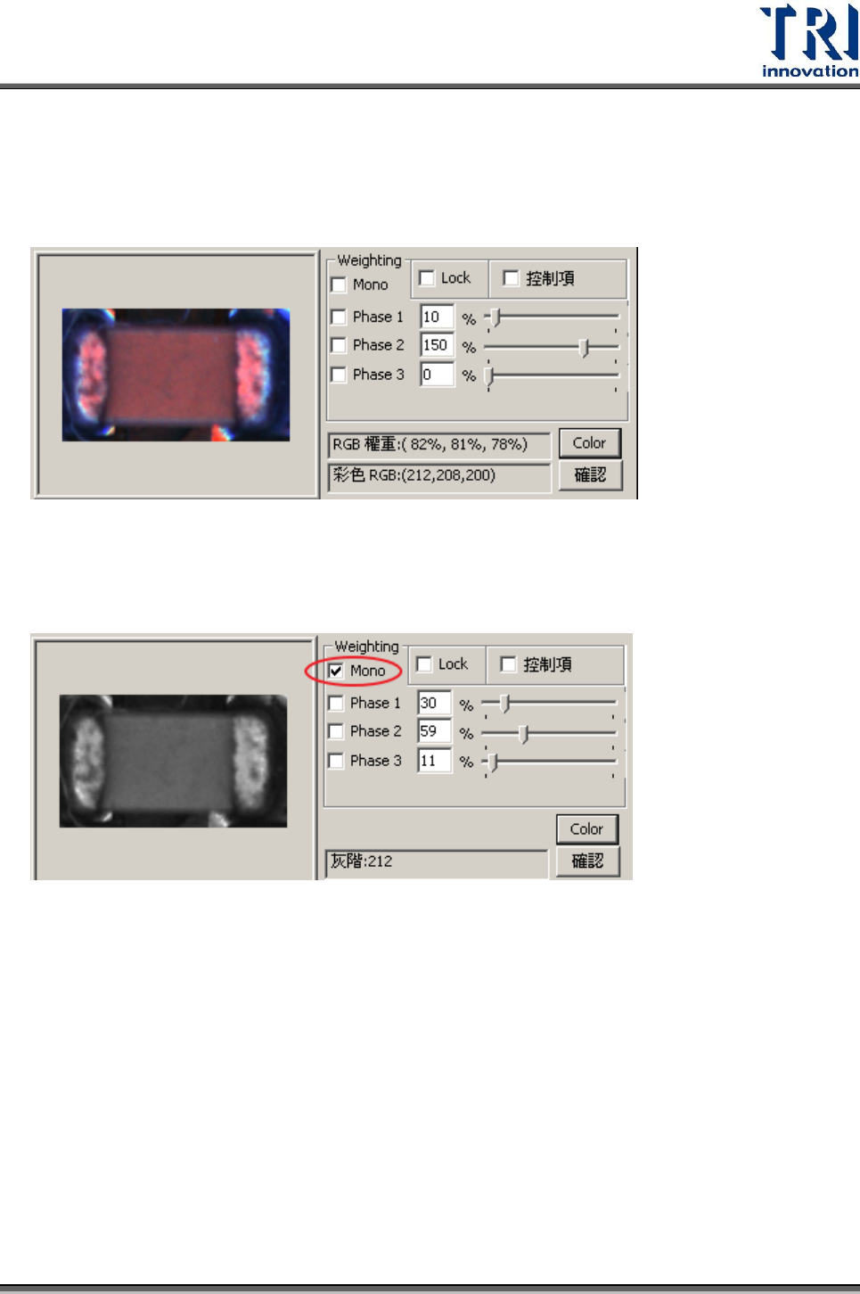 Test Research Inc. TR 7700 S II User Guid e – Softwar e 421 影機經過 RGB Weighting 轉換所取得之灰階影像,其所反應出的影像為亮暗分明、 對比強烈,對於使用檢測框套入做檢測較能有穩定而收斂的效果。