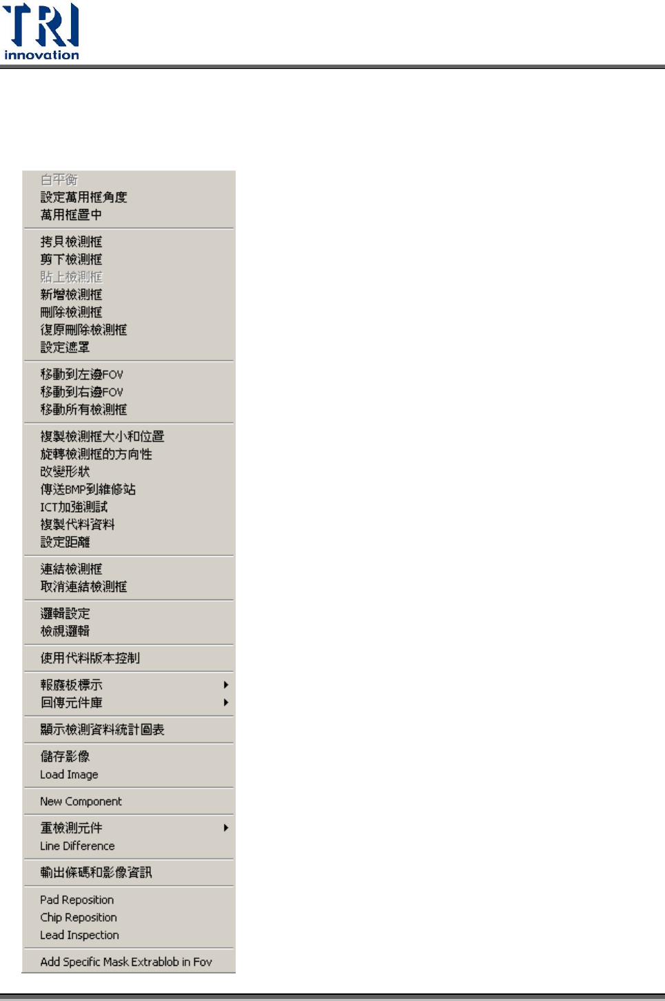Test Research Inc. TR 7700 S II User Guid e – Softwar e 439 5.4.1.1 已儲存 FOV 的功能表 在 FOV 區域內按下滑鼠右鍵會出現功能列表