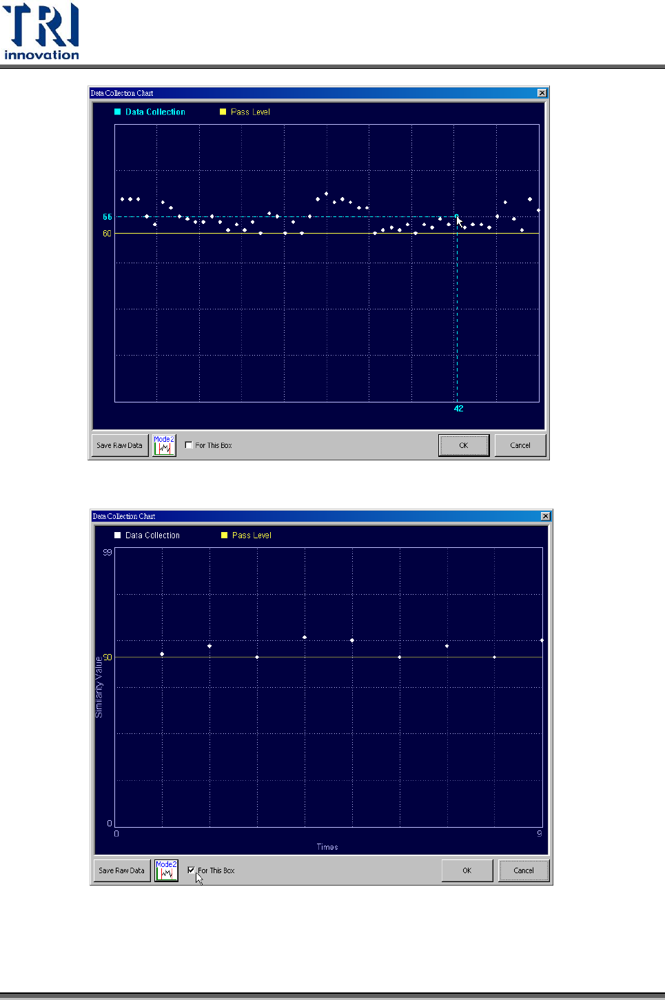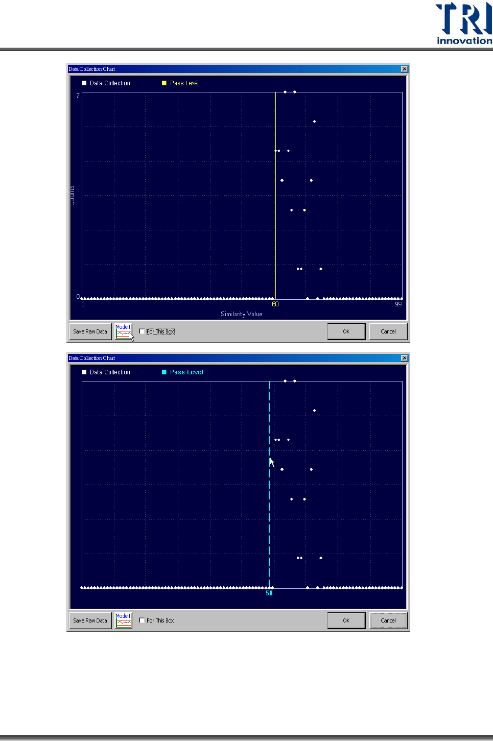Test Research Inc. TR 7700 S II User Guid e – Softwar e 447 勾選 [For This Box] 表示只繪出所點選該顆元件的檢測結果。 點選 [Mode2] 按鈕,可以以第二種圖形表示檢測結果。橫軸為分數,縱軸為 次數,圖形顯示了檢測結果為該分數的檢測次數。在本圖中亦可以拖曳黃線 直接更改比對條件。