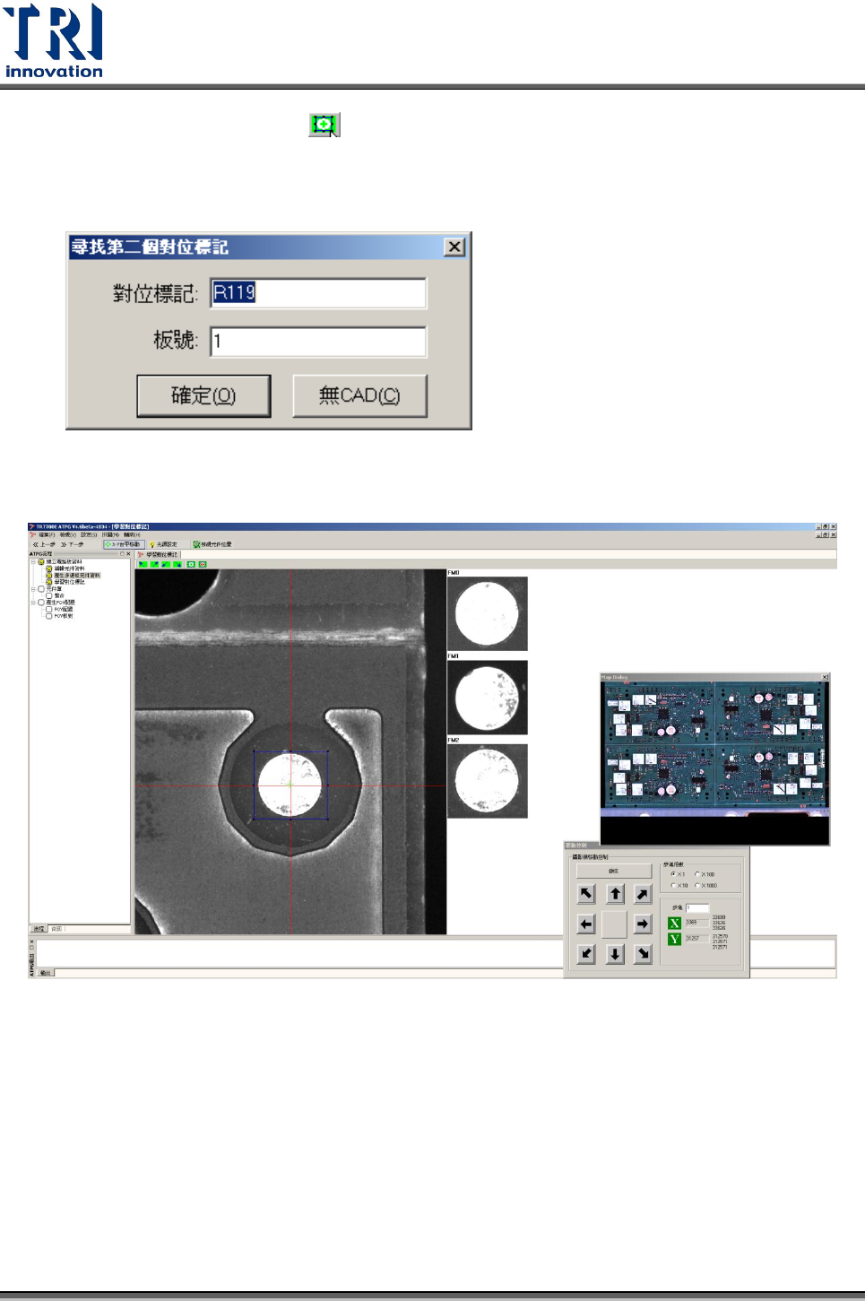 Test Research Inc. TR 7700 S II User Guid e – Softwar e 33 7. 按下 [ 定位對位標記 ] 按鈕 ( ) ,設定第二對位標記點 8. 輸入第二個對位標記點的名稱以及所在的板號,按 [ 確定 ] 。或按下 [ 無 CAD] 使用手 動尋找定位標記位置。 9. 同設定第一對位標記的方式去擷取第二與第三 對位標記點。完成後,會如下圖所 示,影像右方會有三顆對位標記點的縮圖。