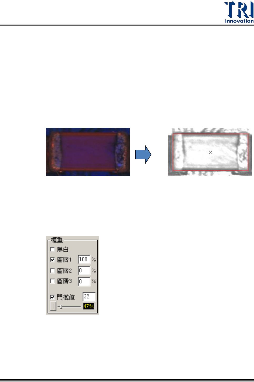 Test Research Inc. TR 7700 S II User Guid e – Softwar e 457 iv. 如果需要使用反白二質化,可以勾選 Inverse 。 v. 當權重設定完成,在 Chip Reposition 視窗按下 [Get Parameters] 按鈕。 vi. 按下 Apply 按鈕完成設定。 (2) 色彩空間法 (Color Space) : i. 使用滑鼠右鍵在擷圖 Chip 縮圖上的電極區拖曳…