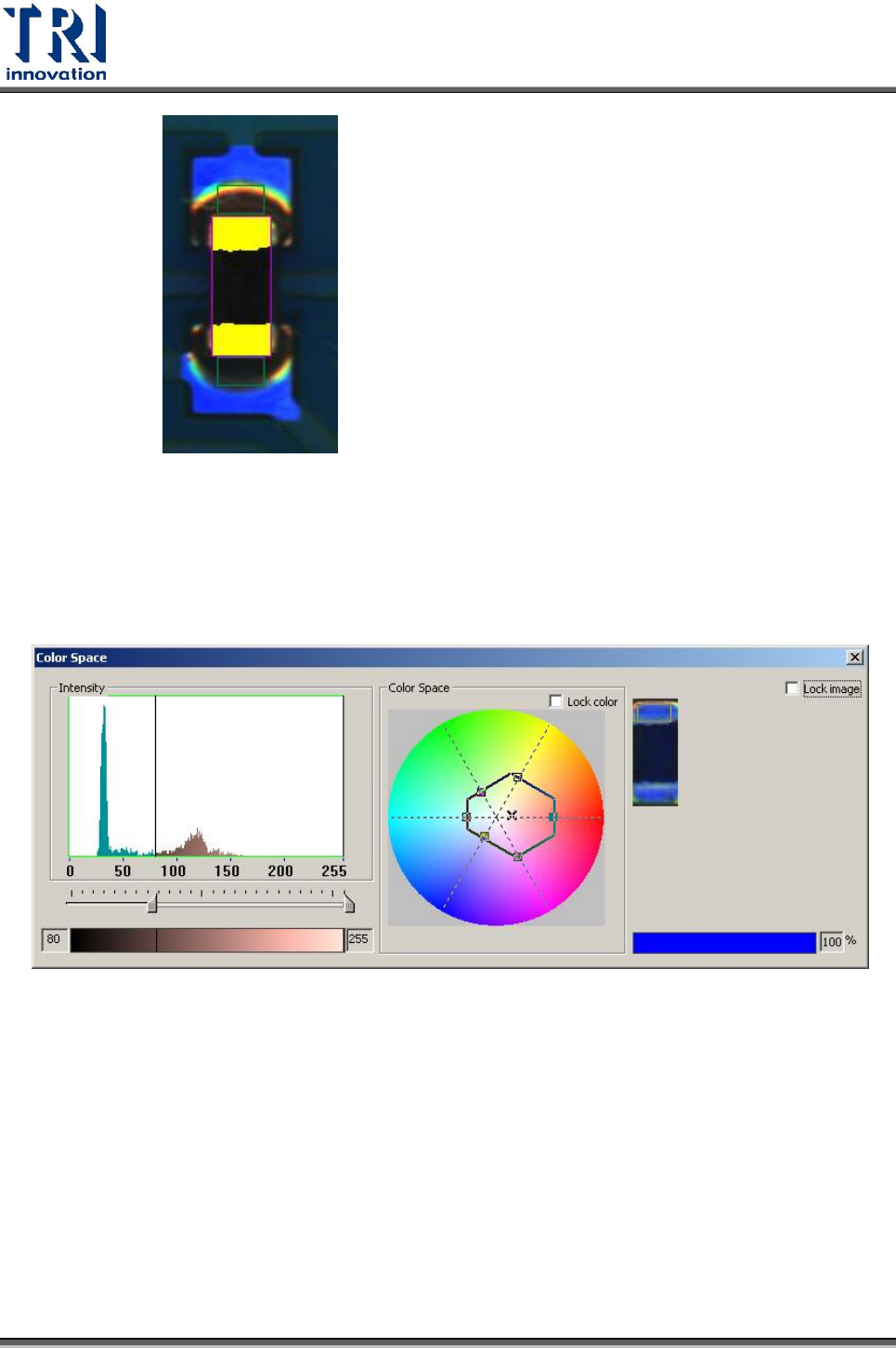 式即自動做分析,並顯示出電極區的亮度與色彩空間區域。