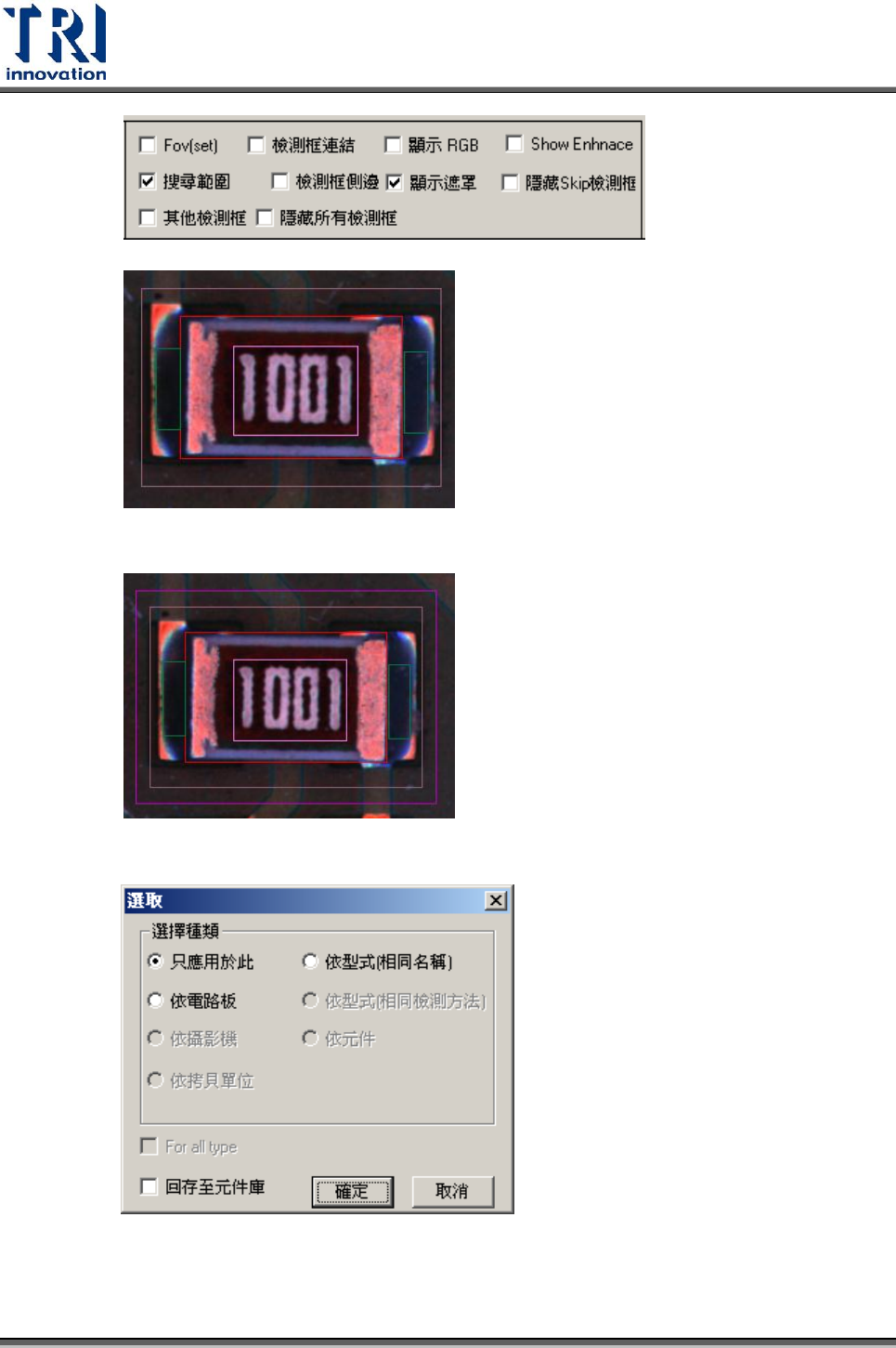 Test Research Inc. 462 TR 7700 S II User Guid e – Softwar e Step4. 選擇套用規則即完成新增代料影像。 Step5. 可點選該檢測框後,在下方視窗中檢視新增的代料影像。 3. 教導 教導 所 選擇 的 該顆 元 件。 教 導 表示 將 標準 影 像、 參 數以 及 其他 設定 套 用到 本 顆元 件 上, 系統只會對有經過教導的元件進行檢測。 4. 解除教導 按下以解除教導…