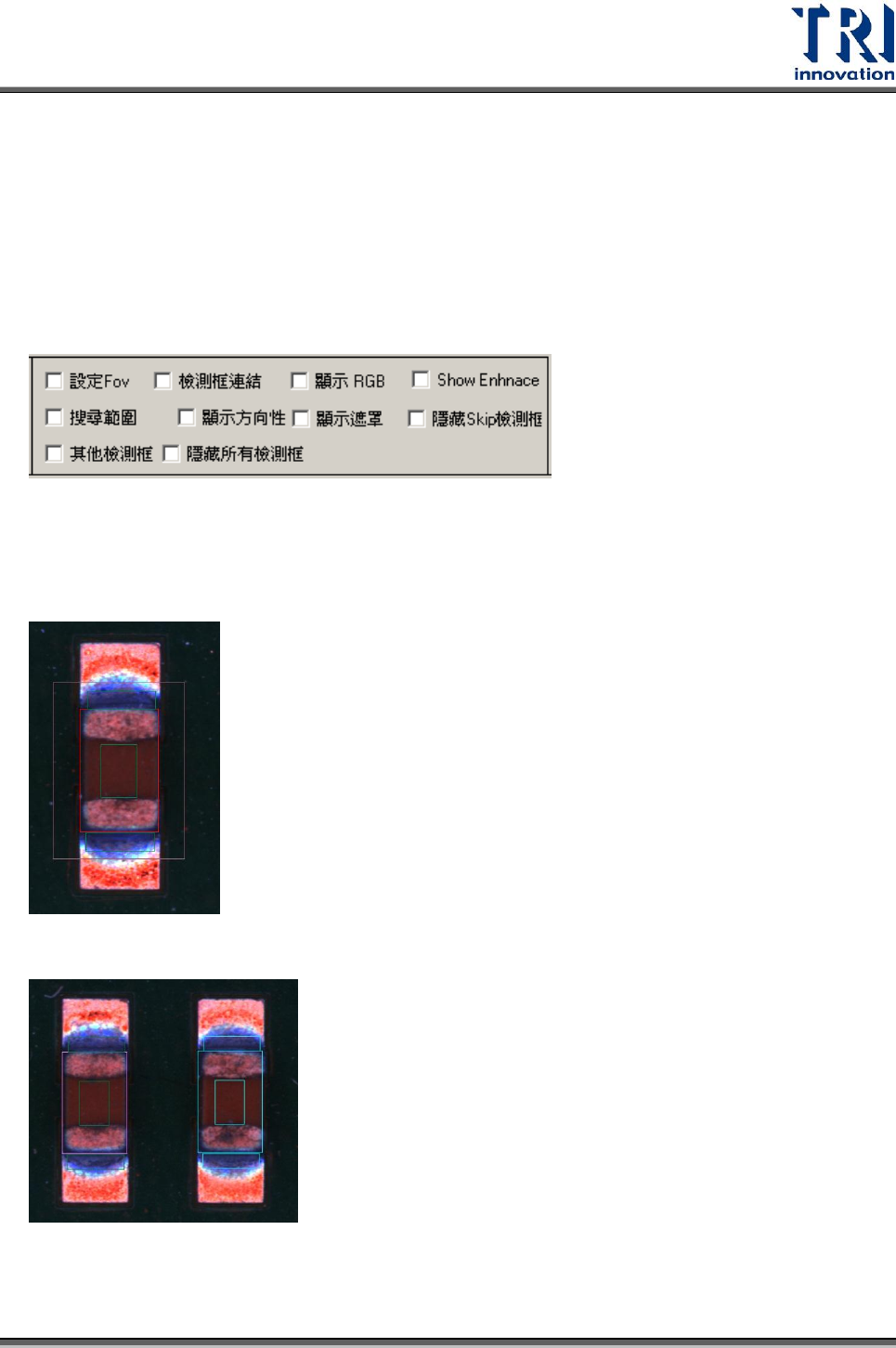 Test Research Inc. 470 TR 7700 S II User Guid e – Softwar e H 表示萬用框垂直方向長度,單位為畫素 (pixel) ,括號內單位為公厘 (mm) 。 Di 表示萬用框對角線長度,單位為畫素 (pixel) ,括號內單位為公厘 ( mm) 。 5.5.6 檢視控制區 在此可選擇要在 FOV 影像上檢視的項目。 1. 設定 FOV :在電路板大圖會僅顯示第一子板的 FOV …