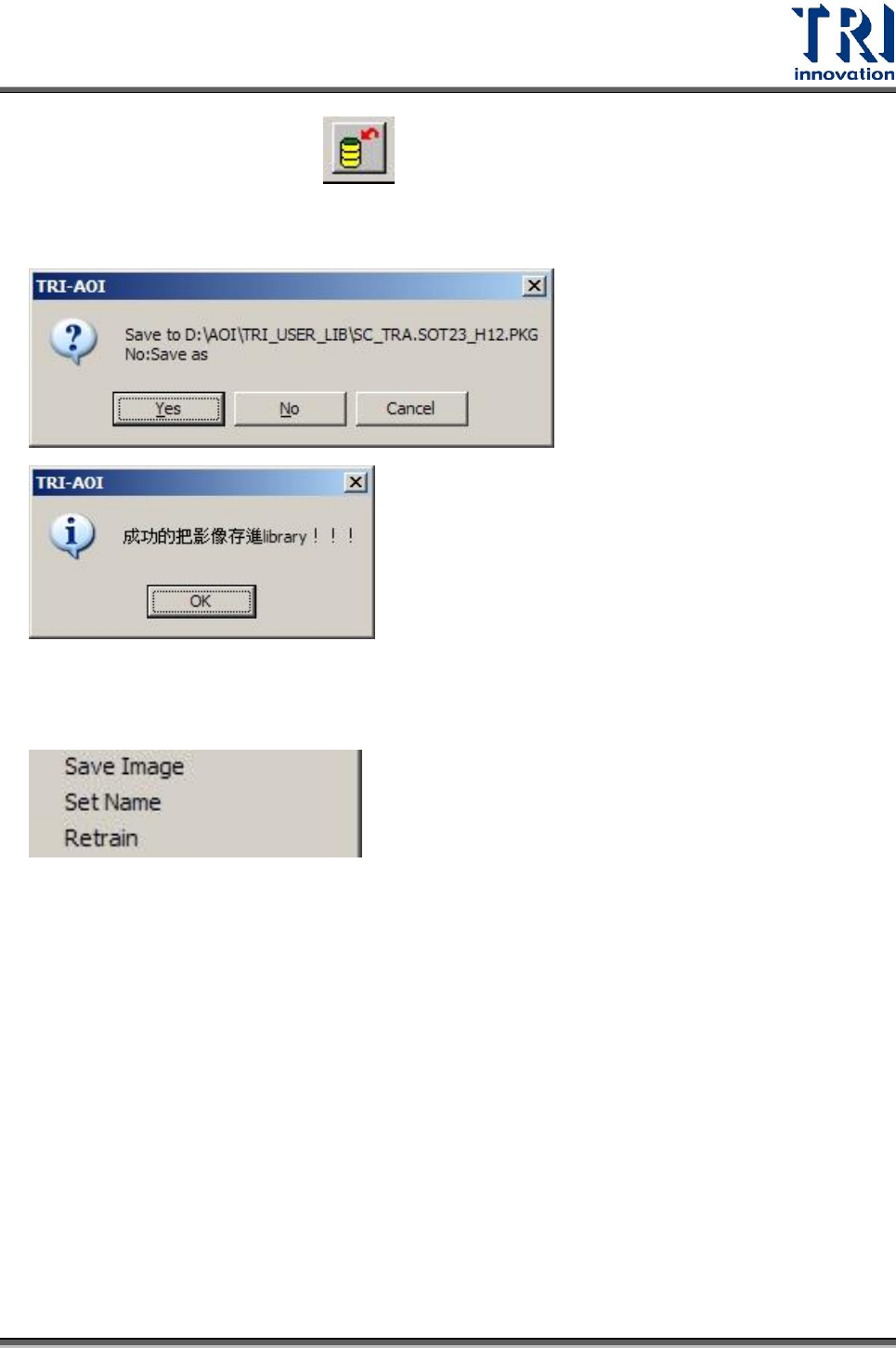 Test Research Inc. 482 TR 7700 S II User Guid e – Softwar e 7. Set alternative to library – 可以將此處看到的代料影像存回至元件影像資 料庫中,並與元件資料庫相連結。首先選擇要回傳之影像,接著按下 [ 回存資料 檔 ] 後,選擇元件資料庫位置以及名稱,即可完成設定。 在代料影像上按右鍵,會出現以下功能表。 S ave Image :可將點選…