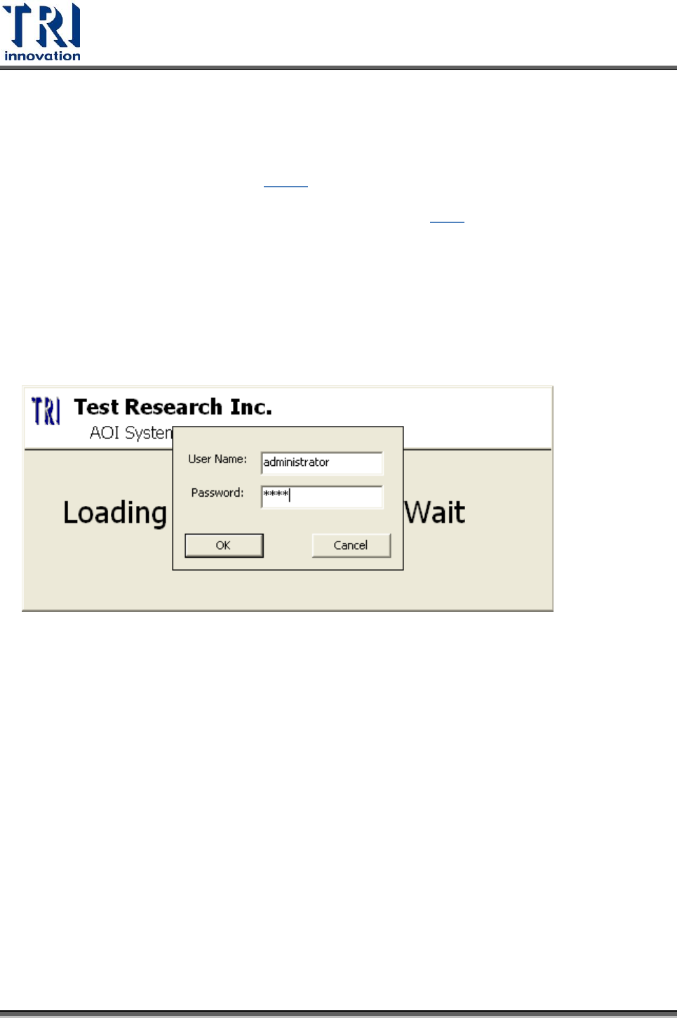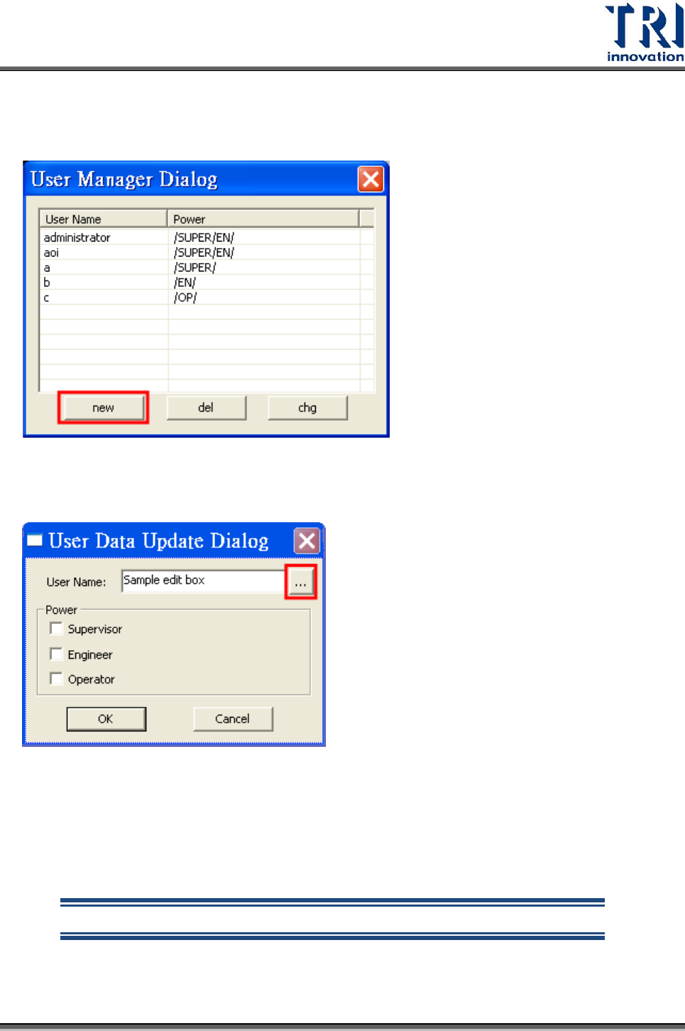 Test Research Inc. 500 TR 7700 S II User Guid e – Softwar e 2. 開啟 [Ut ilities/ User manager] 3. 按 [ new ] 來新增使用者 4. 按 [Use r Name] 旁的 [ … ] 的按鈕來啟動條碼機,讀入員工証的條碼。 5. 在 [NG Dialog] 按 [ F4 ] 可啟動條碼機,使用者此時使用條碼機刷入資訊後登入程式 中,如果使用者…