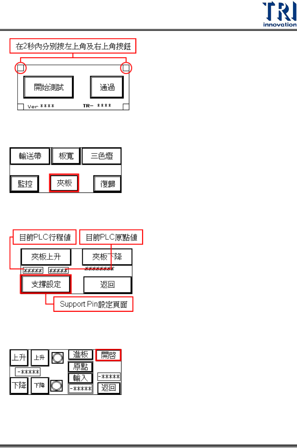 Test Research Inc. TR 7700 S II User Guid e – Softwar e 513 PLC 頁面說明 Step9. 兩秒內連續按下左上角及右上角之隱藏鍵。