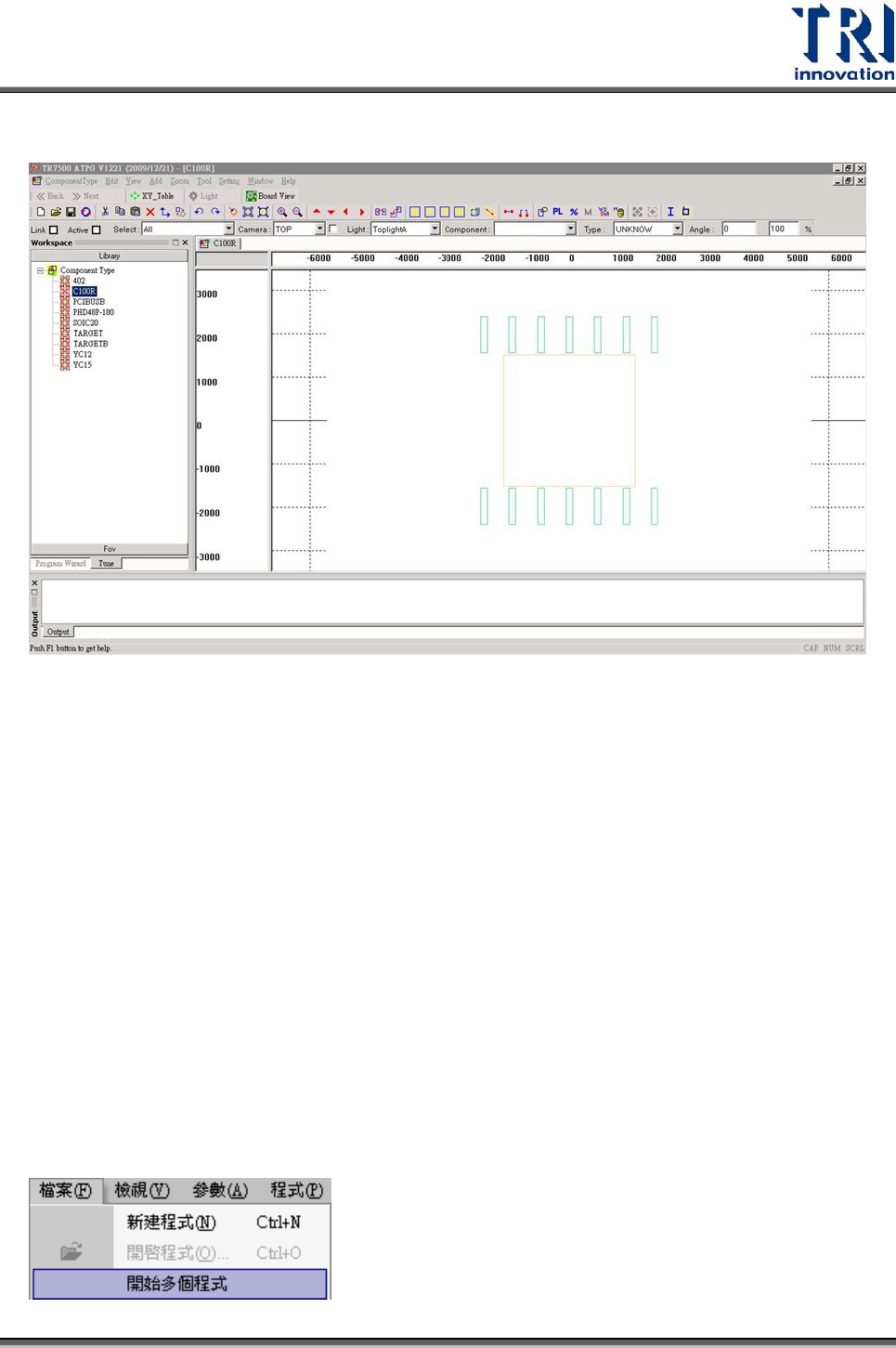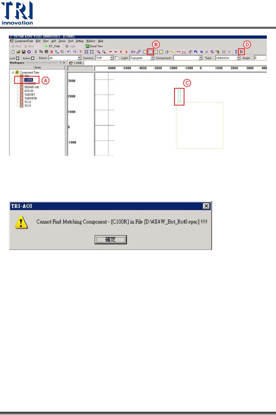 Test Research Inc. TR 7700 S II User Guid e – Softwar e 521 如果所選擇的元件,並沒有存在於 epac 檔案中,則會顯示找不到相對應元 件的訊息。 元件的 Body 框會影響腳位產生,所以 Body 框的大小要根據實體影像,拉 出正確的框。
