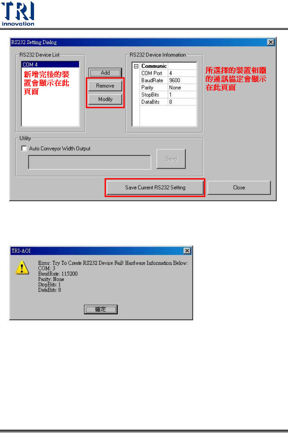 如果新增的 RS232 裝置無法建立起來,會顯示下面的訊息。表示硬體的通訊協定與使