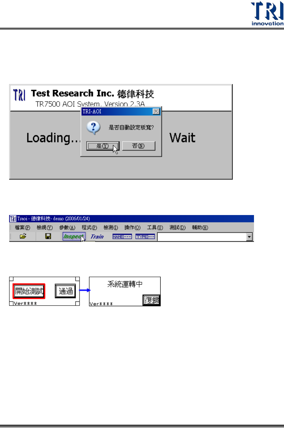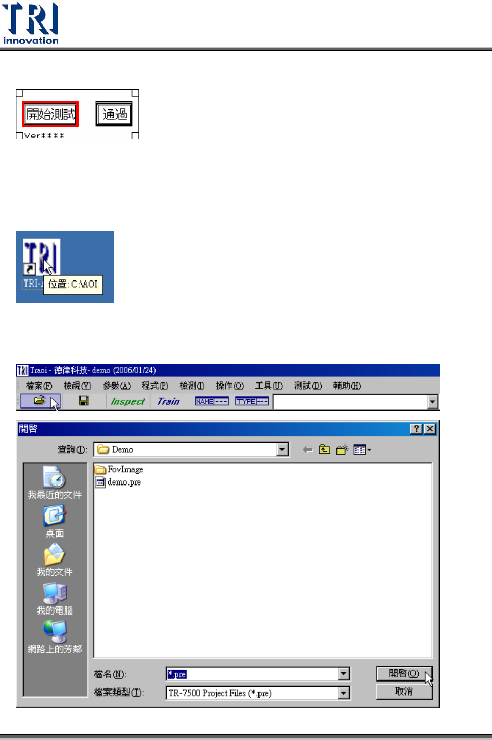 Test Research Inc. TR 7700 S II User Guid e – Softwar e 553 人機界面回到待機畫面如下。 8.2 開啟檢測程式 1. 對桌面捷徑雙擊滑鼠左鍵開啟 AOI 主程式 2. 載入檢測程式 (*. pre) 檔案