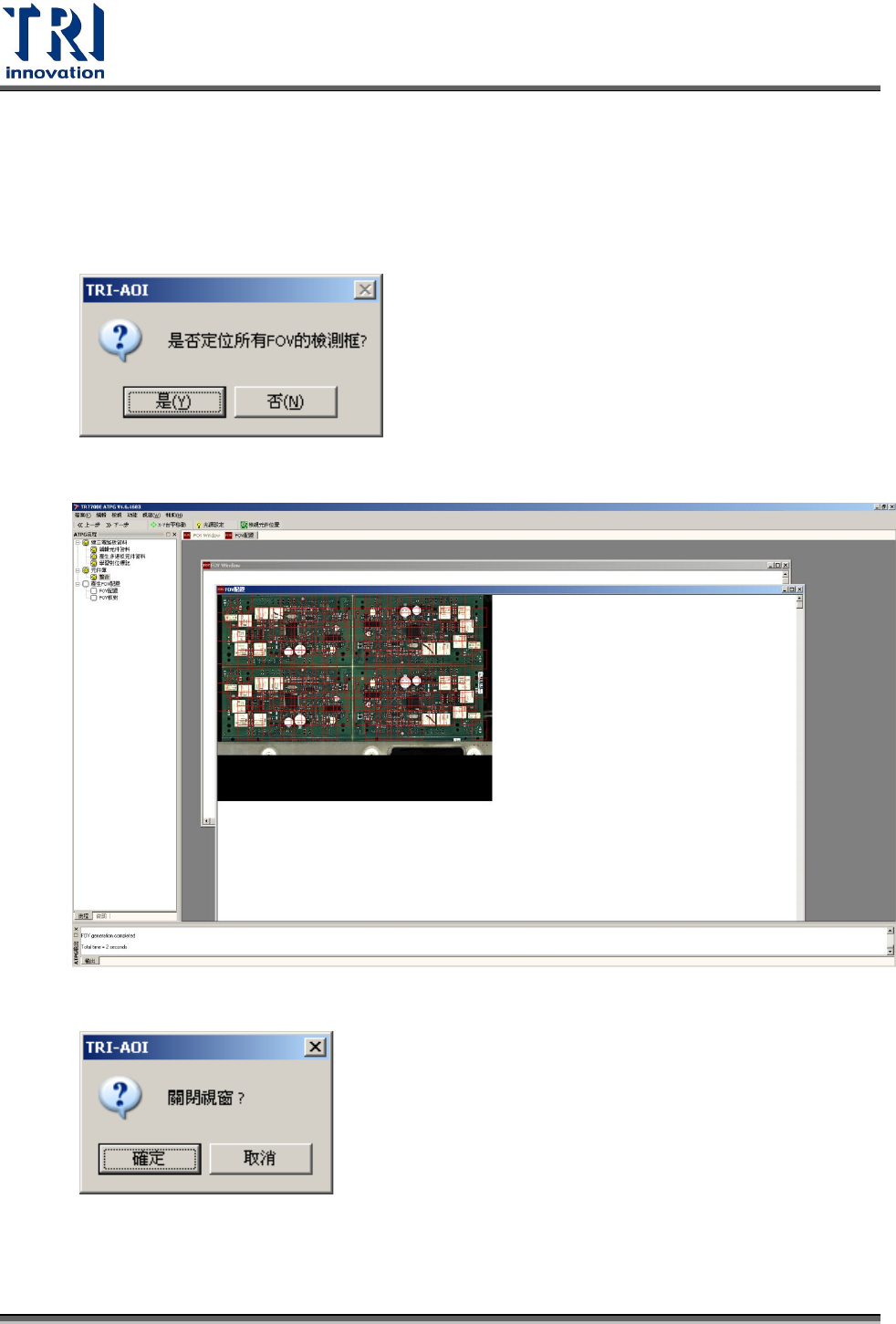 Test Research Inc. 44 TR 7700 S II User Guid e – Softwar e 2.8.2 FOV 核對 在此步驟系統會列出關於這片電路板的所有資訊清單,若有需要可以在此清單中獲得 所需的 FOV 資訊。 1. 按下 [ 下一步 ] 按鈕後, 系統會以下視窗,請按下 [ 確定 ] 。 2. 此時, ATPG 流程已全部完成,可按下 按鈕來結束 ATPG 視窗。