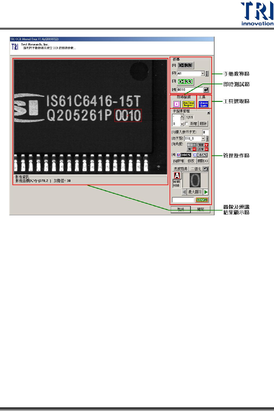 Test Research Inc. 590 TR 7700 S II User Guid e – Software 1. 手動教導區:依四步驟來進行教導,各為拉框、選取字型庫、字串學習及確認 學習結果。 2. 即時測試區:當 OCR 字串教導完成後,可利用此功能進行 Off -Line 檢測,檢 測的結果即為 Run-Time 時的結果。 3. 工具選取區:可點選 Font Library( 字型庫 )/Check Sum( 比對條件…