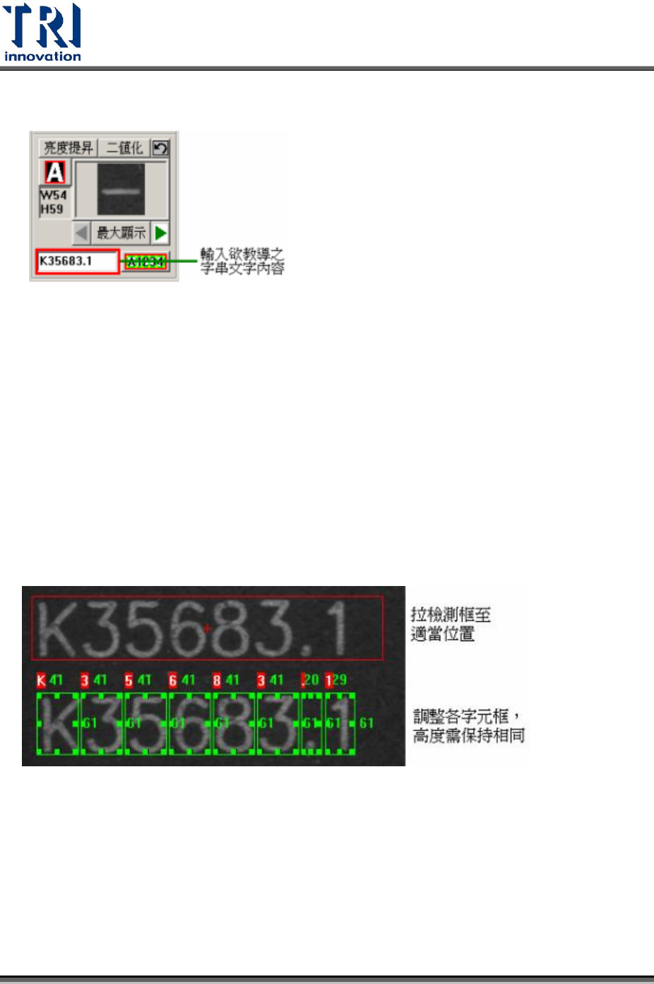 Test Research Inc. TR 7700 S II User Guid e – Software 595 1. 輸入欲教導字型之字串。 2. 按下多數字型教導框按鈕。 ( 按鍵圖示如右圖所示 ) 3. 將一個個可調整之教導框放置定位。 4. 設定所屬之字型種類。 5. 選定所屬之角度。 6. 選定所屬之字元 / 背影顏色。 ( 黑底白字或白底黑字 ) 7. 按下「新增 (Add) 」以新增到字型庫內。 4.6.2 Check…