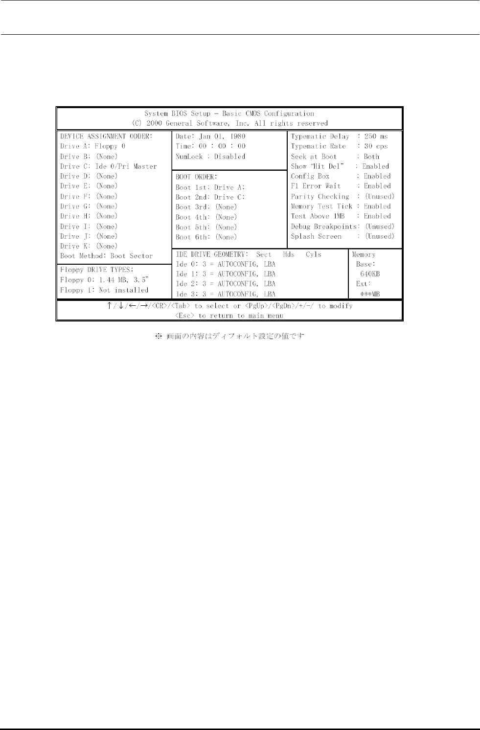 Rev2.00 维修调整要领书 2) “ Basic CMOS Configuration ” 画面 “ Basic CMOS Configuration ” 画面的显示如下所示 。 3) “ BOOT ORDER :” 栏的变更 指定驱动器检索顺序号 。 Boot 1st: Drive A: →Boot 1ST: Drive C: Boot 2nd: Drive C: →Boot 2nd: Drive A: 请变更 。 4)“ Mem…