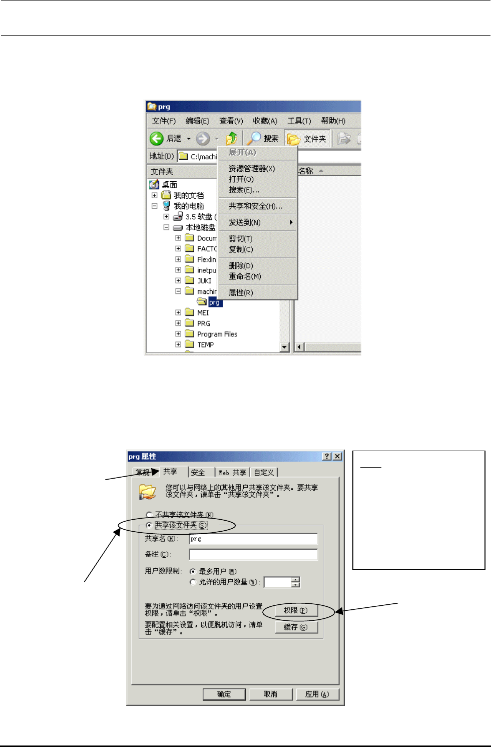 Rev2.00 维修调整要领书 5 )右键点击 prg 文件夹,请选择「共享和安全( H ) 」或「属性( R ) 」 。 6 ) 于是显示 「 prg 的属性」 对话框, 点击该对话框的① [ 共享 ] 选项卡, 选择② 「共享该文件夹」 , 并确认 「共享名」已成为“ prg ” 。 • 如果共享名还不是“ prg ” ,请修改为“ prg ” 。 • 如无特别指定, [ 用户数限制 ] 一栏设定为 [ 最多用户 ] 。 其它“p …