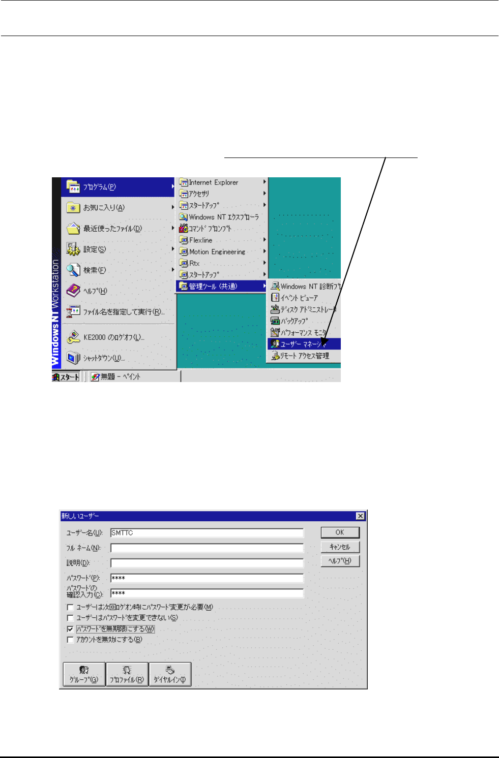 Rev2.00 维修调整要领书 13-5-4-3 用户登记的设定 有 HLC 的 PC( 电脑 ) 起动时进行输入,把 用户名 和 密码 登记到 KE2000。 1) 请确认 HLC 侧 PC 起动时的用户名和密码 。 适用于 NT ----------------------------------------- 2) 选择 Windows NT 的 〈 起动 〉 按键,顺序选择 [ 程序 ]/[ 管理工具 ( 通用 )]/[ 用户管…