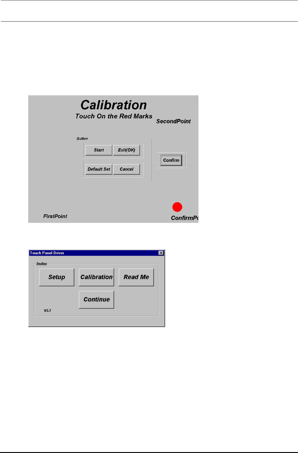 Rev2.00 维修调整要领书 22. 请按 Exit ( OK )按钮回到 Touch Panel Drivers 窗口,再按 Calibration 。 按钮 23. 按下 Start 按钮,会显示 FirstPoint 。 标记,请正确按标记的中心 24. 接着会出现 SecondPoint 。 标记,请正确按该标记的中心 13-52