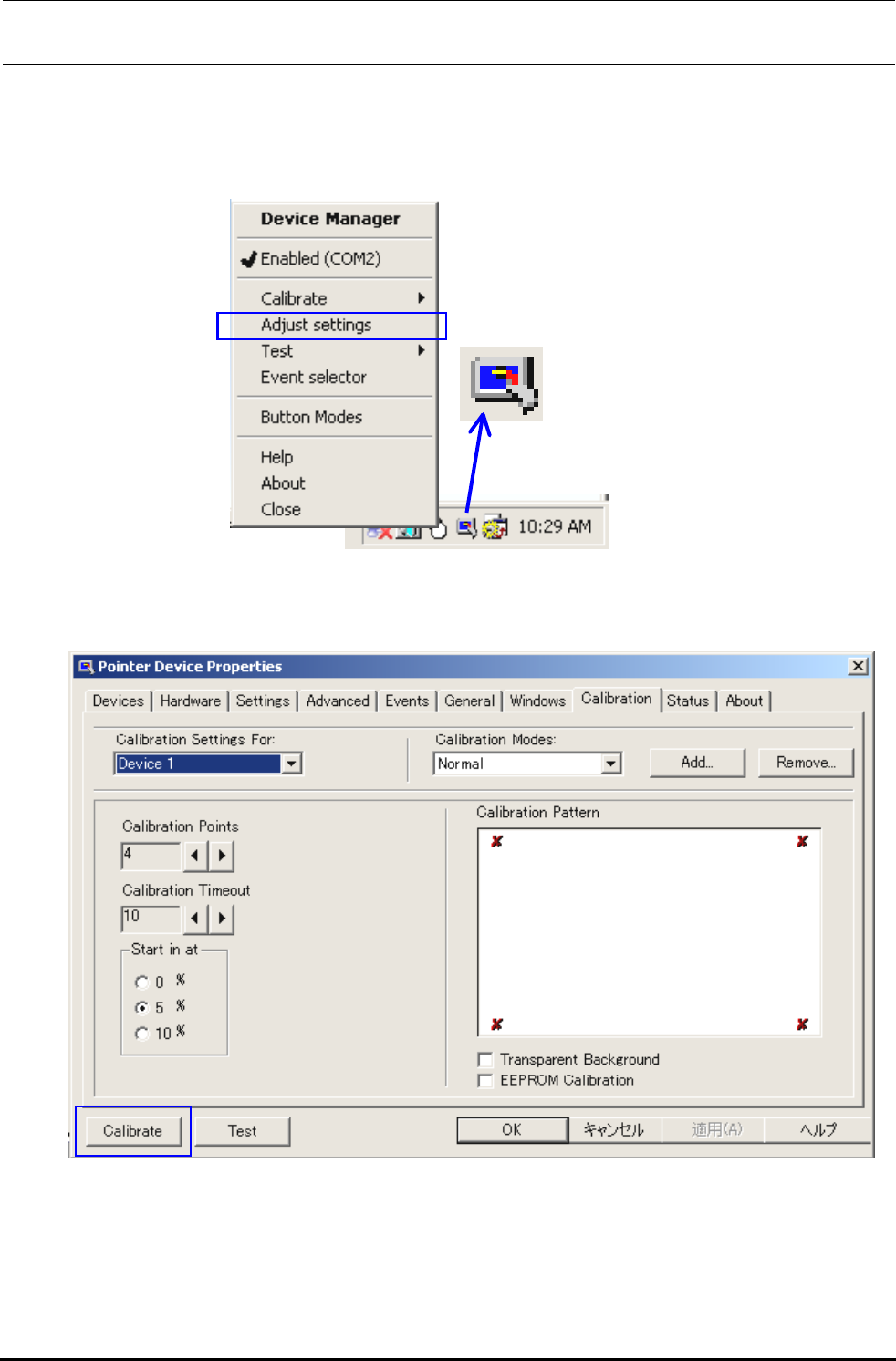 Rev2.00 维修调整要领书 2) 如果是 KE-2050/55/60 R 型时(为 Win XP 时 ※ 同样适用于中文 KE2050/60 XP 规格。 ) 1) 点击桌面右下方通知区域的图标,选择 [Adjust settings] 使之启动。 图 13-3-1-1 通知区域 2) 启动后,会显示下图所示的窗口。点击该窗口左下方的 “Calibrate” 。 图 13-3-1-2 触摸屏设定窗口 3) 显示这一窗口后,请按下图所…