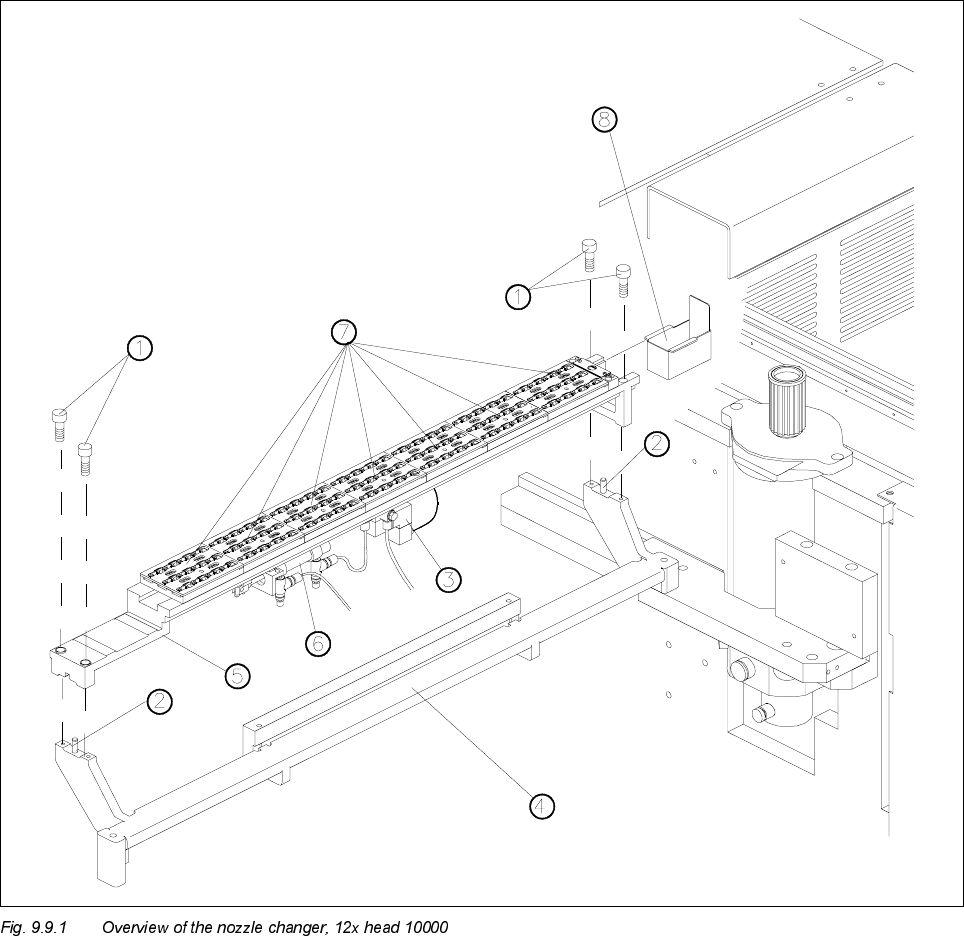 1 Fixing screws for the nozzle changer 2 Centering pins for positioning the nozzle changer