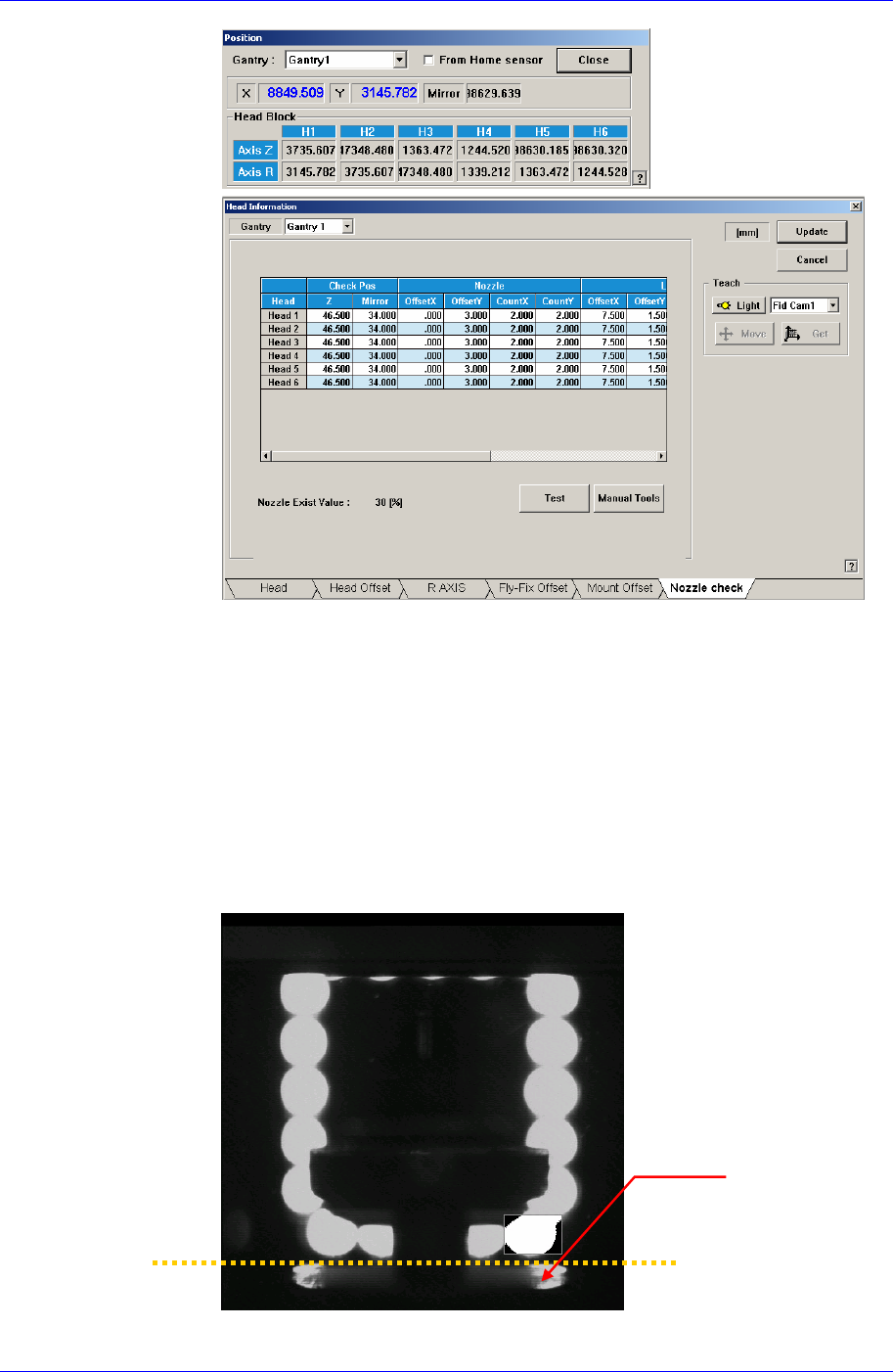 Calibration 3-61 Z 轴高度的示教 (Head Z T eaching) 默认值为 50.5 。 1. 在 View 菜单选择 Current Position 执行“位置” 。 2. 在 Nozzle Check TAP 对话框单击 < 手动操作 > 键,执行“手动控制”对 话框。 3. 在 Axis TAP 对话框的 < 轴 > 组合框选择 Z 。 4. 在 Camera TAP 对话框中…