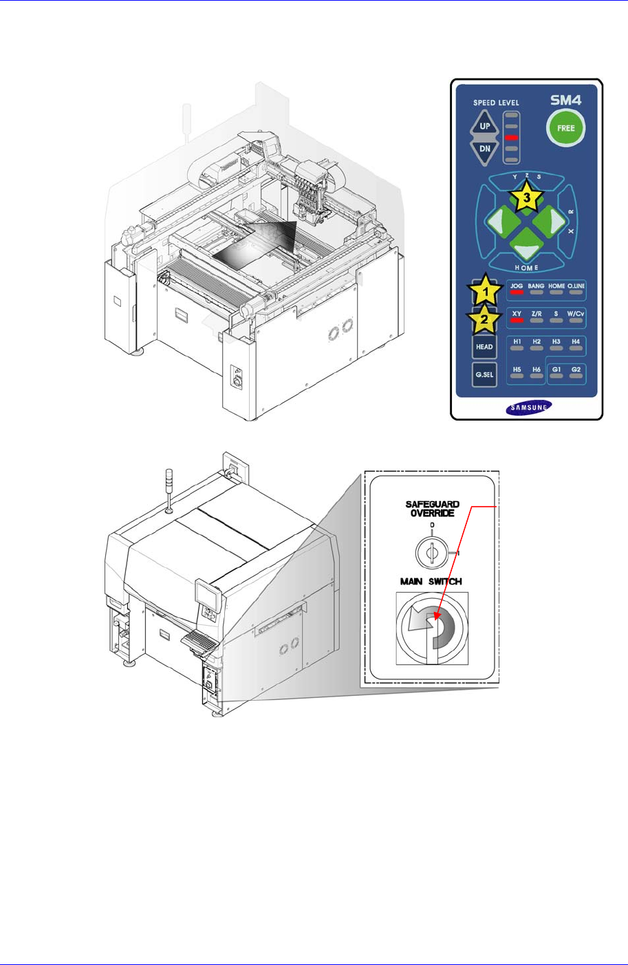 Samsung Component Placer SM421 Service Manual 4-12 4.3. Flying Camera 个别替换 1. 操作示教框,把 X Frame 移动到 后面。 2. 请正常关闭 PC 后,关闭设备前面的 Main Switch 。 Main Switch 的 OFF 方向 ( 逆时针方向 )