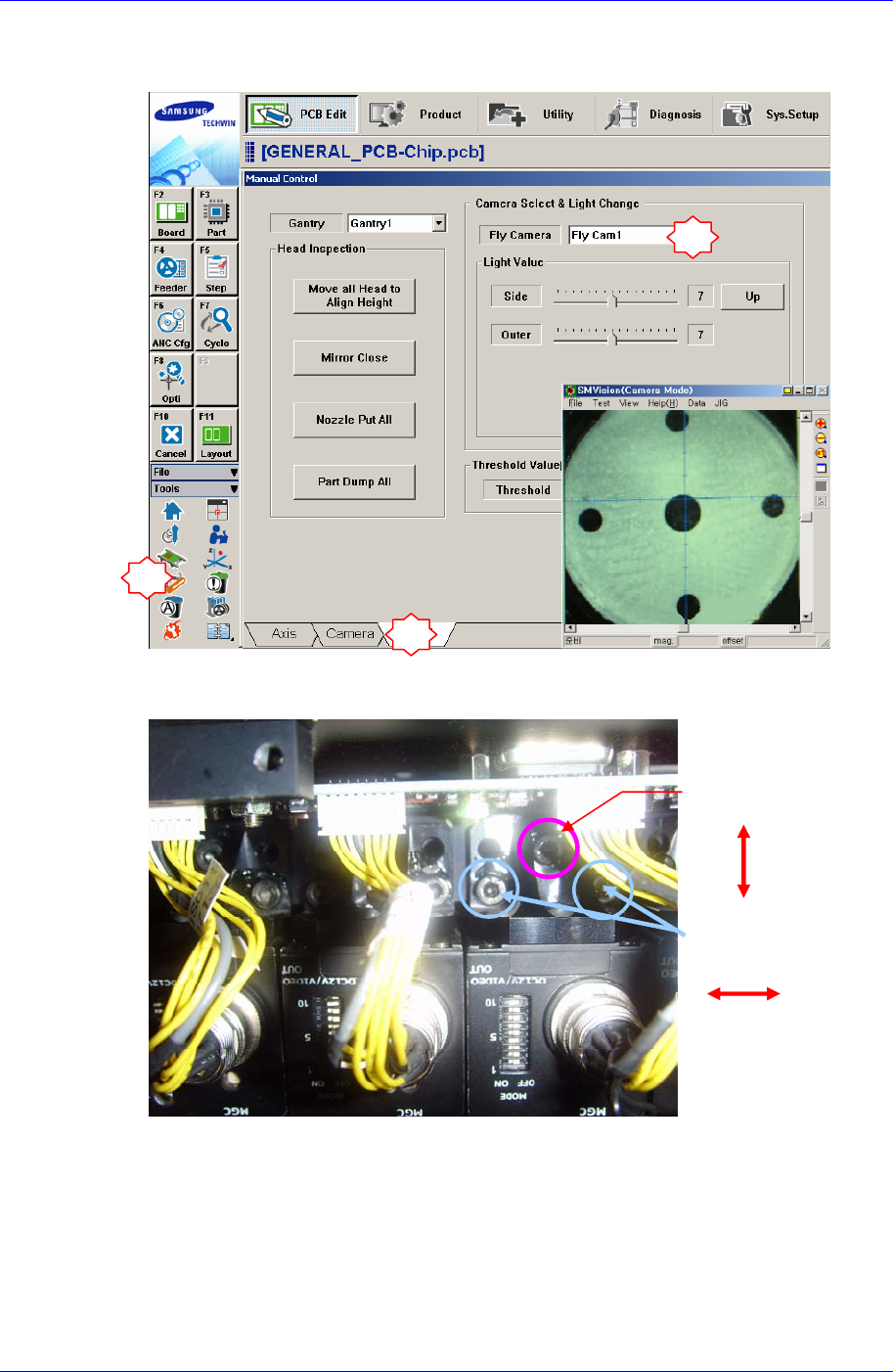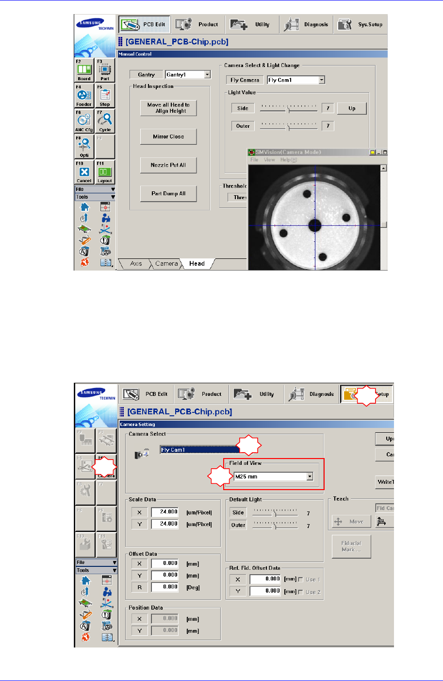 Samsung Component Placer SM421 Service Manual 4-18 11. 请利用 LOCTITE(LOCTITE 243) 组装螺丝。 12. 利用螺丝对 摄像机中心时,对准摄像机中心后,请务必拧紧固定螺丝 (M3-3 个 ) 。组装好盖后,请执行 Wa r m - U p 。 13. 请执行 Fly camera scale calibration 。详细事项请 参照 “ 오류 ! 참조 원본을 찾…