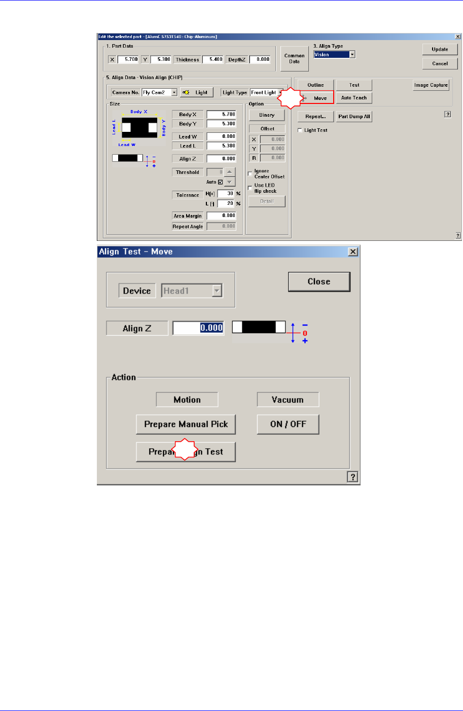 先点击<Move>按钮后,再点击<Prepare Aligne Test> 按钮。