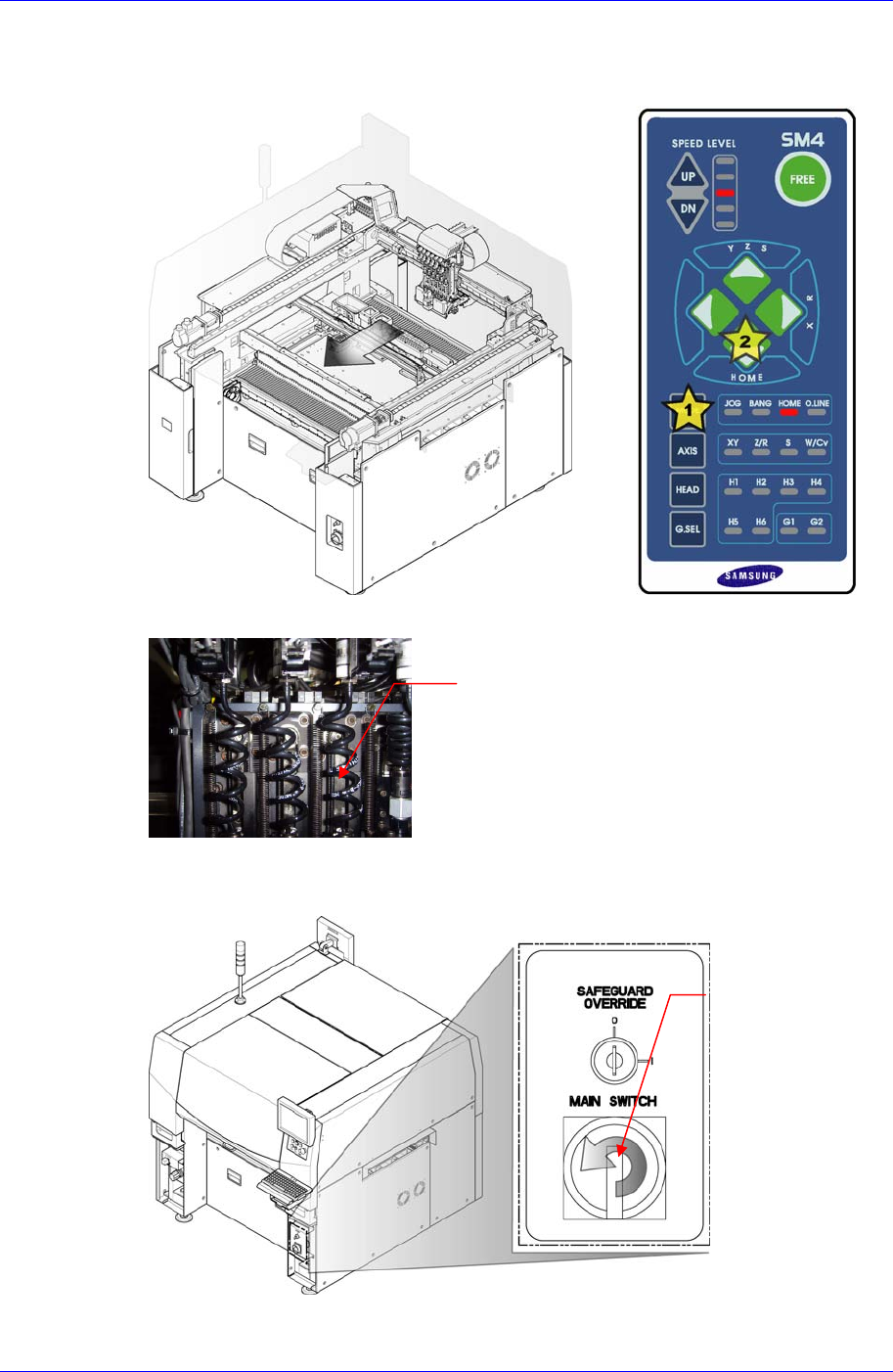 Head Module 4-53 4.8.3. T iming Belt 替换次序 1. 操作示教框设备执行初始化 (Ho ming) 。 2. 考虑作业方便首先除去所要替换 的电动机或皮带相应的头 部空气管。 3. 对 Z 轴执行 Home 。 4. 正常关闭 PC 后,关闭设备前面的 Main Switch 。 空气管 Main Switch 的 OFF 方向 ( 逆时针方向 )