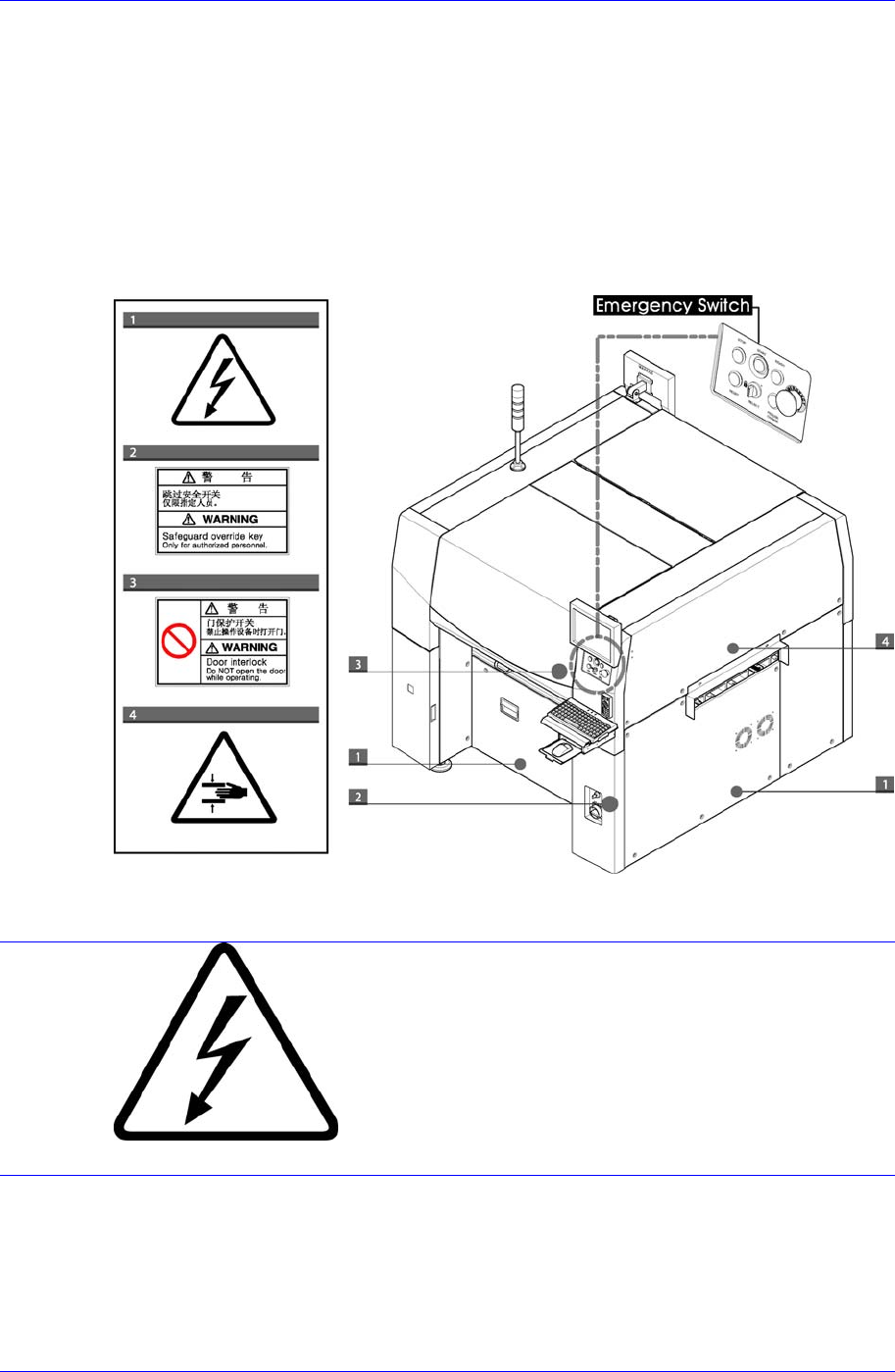 前言 iii 安全注意事項 (Safety Precaution) 如下图所示,设备在各指定的位置上贴有标签。 应按照各标签上的指令安全操作设 备。如果某个标签掉下来或有毁损,应对照下面 的数字将新表签贴在适当的位置。 关于订购新标签或其它任何问题,改善或建议, 请联系本公司营业部门或本公司指 定的 C/S 中心 (STS) 。 设备前面 设备前面贴有以下标签 图 0-1. 设备前面的安全标 签 盖子内侧及周围连接物部位存在高电压要…