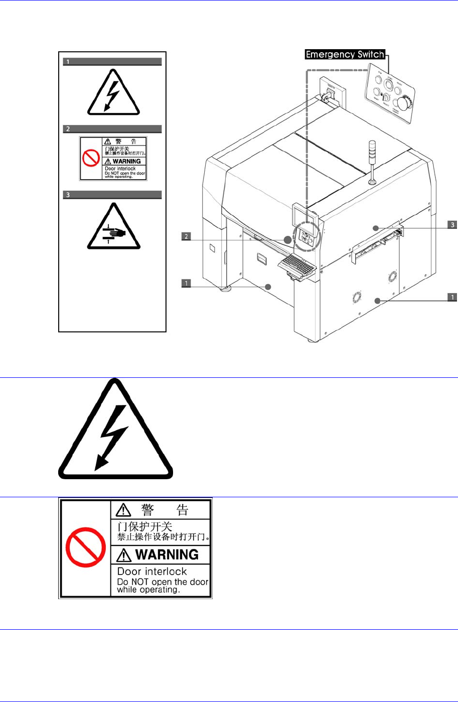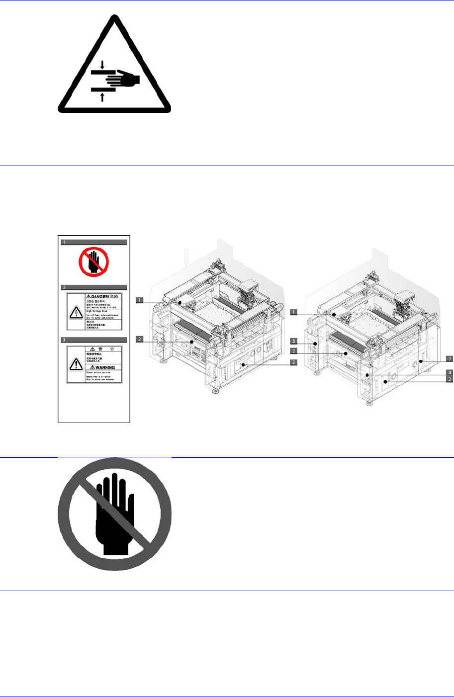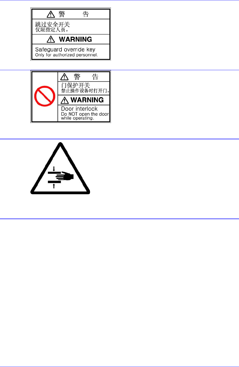 前言 v 设备后面 设备后面贴有以下标签 图 0-2. 设备后面的安全标 签 盖子内侧及周围连接物部 位存在高电压要注 意电击危险。 在维护和修理设备操作时 一定要先切断主电 源。 运行中禁止手触摸 贴有此标签的位置设置有移动体 ,在运行 时如果分解移动体或将盖子打开 ,身体某 部分伸入到设备内部是非常危险 的。