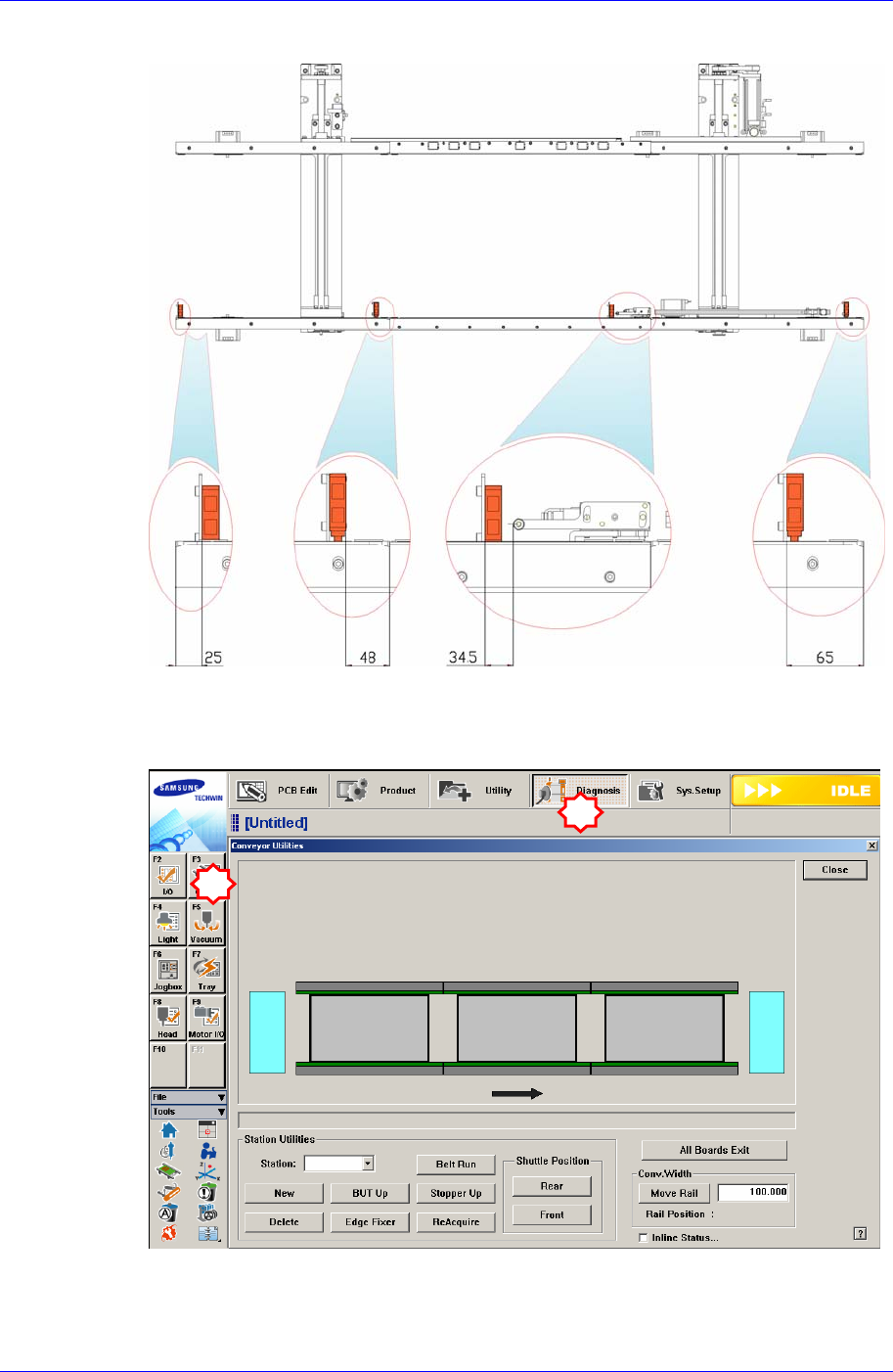 4. 为了确认传感器工作与否,请执行 “Conveyor Utilities” 对话框。 投入PCB确