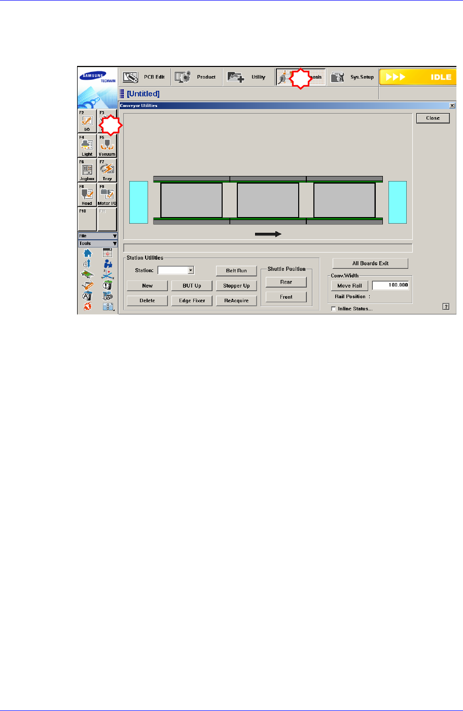 12. ‘请执行‘Conveyor Utilities’对话框。投入 PCB 后确认各 Station 的基板传感器及