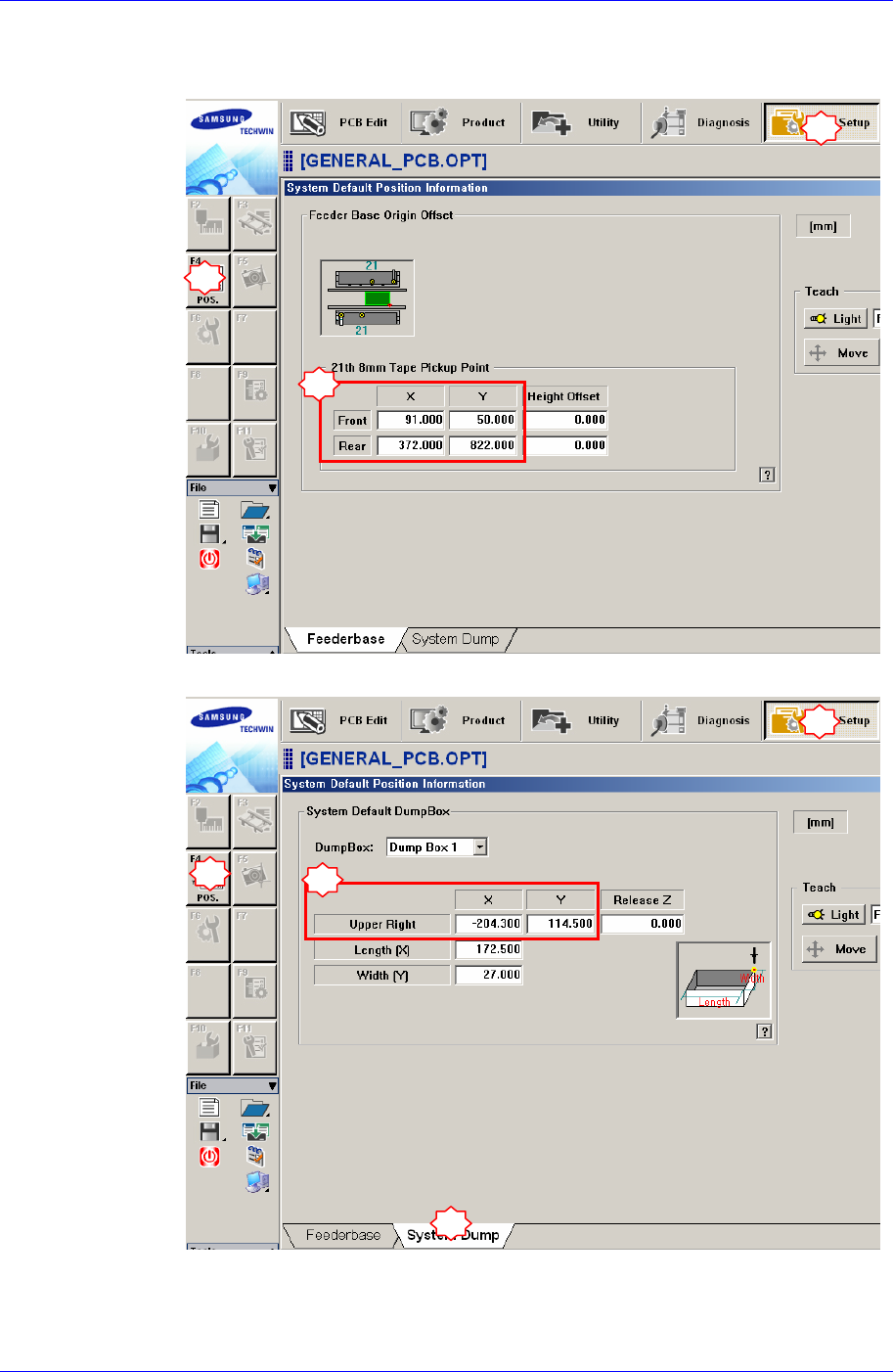 X-Y Frame 6-1 1 8. 请重新示教设备基准坐标点。 Feeder Base Origin ( 详细事项请参照 “ 3.3 Feeder Base Origin ” ) Dump Box (Sys tem Du mp 及用户定 义 Dump Box) 1 2 3 4 1 2 3