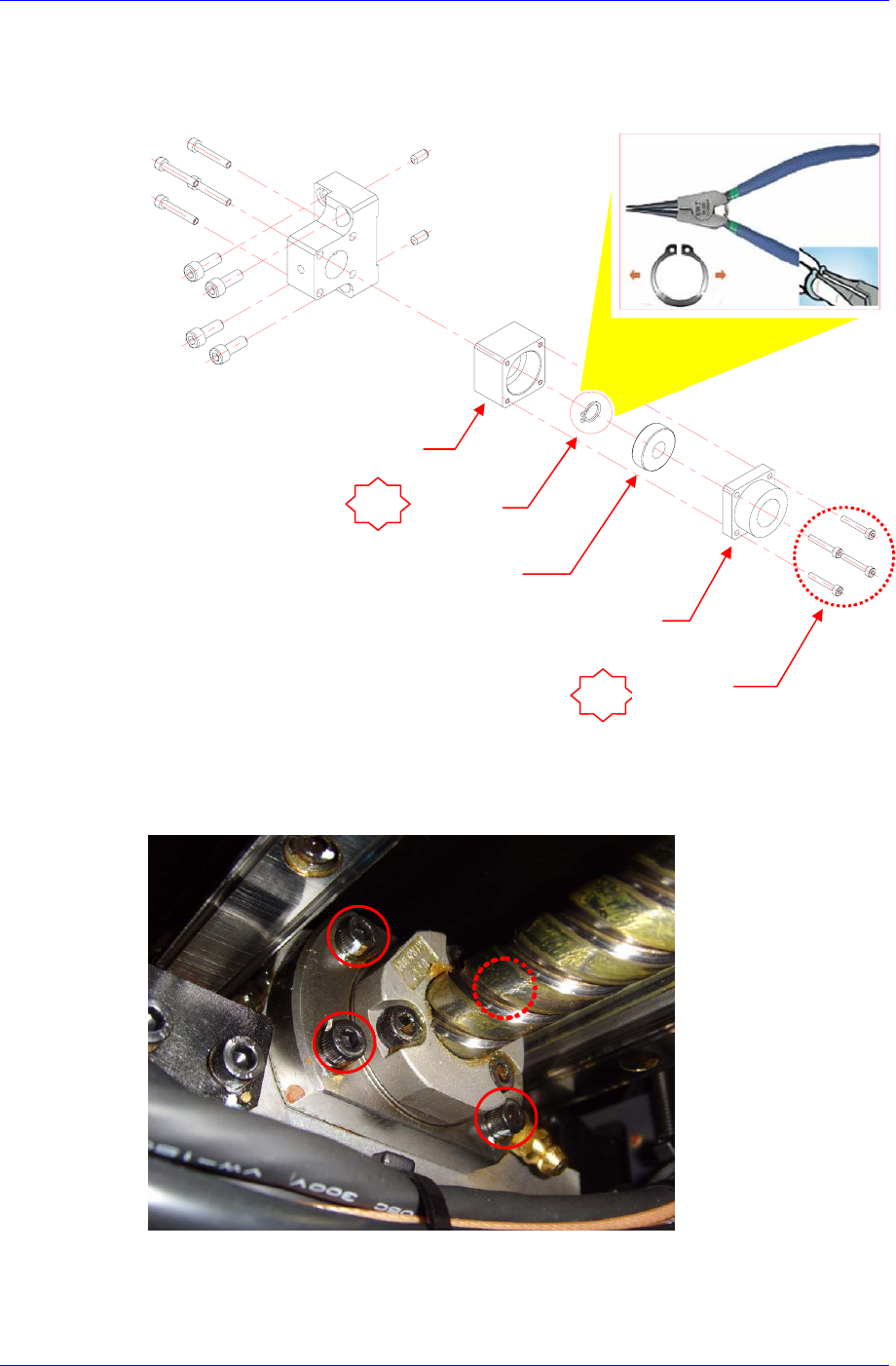 ⑥ 用卡簧钳清除卡簧后从滚珠丝杠中分离轴承。