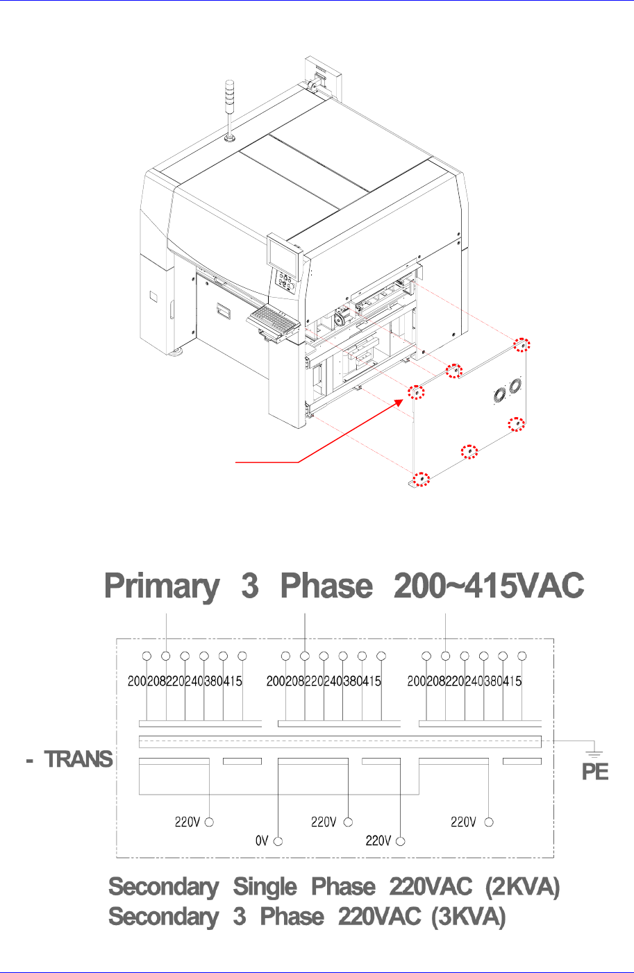 Electric Device 1 1-21 11.4.4. T ransformer 输入电源切换部变更 1. 请正常关闭 PC 后,关闭 设备前面的 Main Switch 。 2. 请务必关闭设备后面的 MCB 完全切断电源。 OFF 主电源切断器 (Main Circuit Br eaker) Main Switch 的 OFF 方向 ( 逆时针方向 )