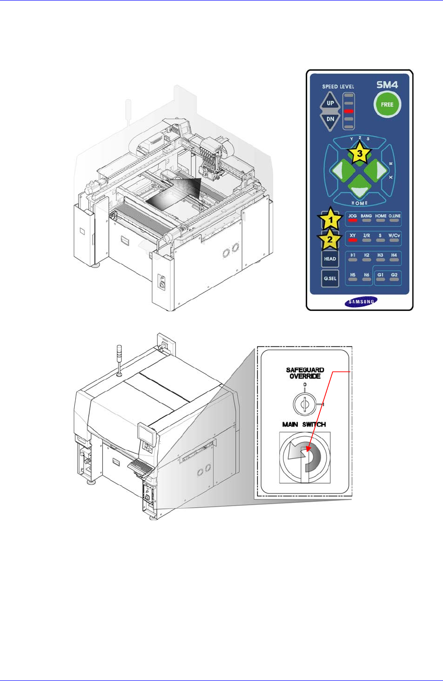Samsung Component Placer SM421 Service Manual 13-10 13.3.3. Head Module Board 替换次序 CAN Head Illumination Board/ CAN Head I/O Board 1. 操作示教框把 X Frame 移动到后面。 2. 请正常关闭 PC 后,关闭 设备前面的 Main Switch 。 Main Switch 的 OFF 方向 ( 逆时针方…