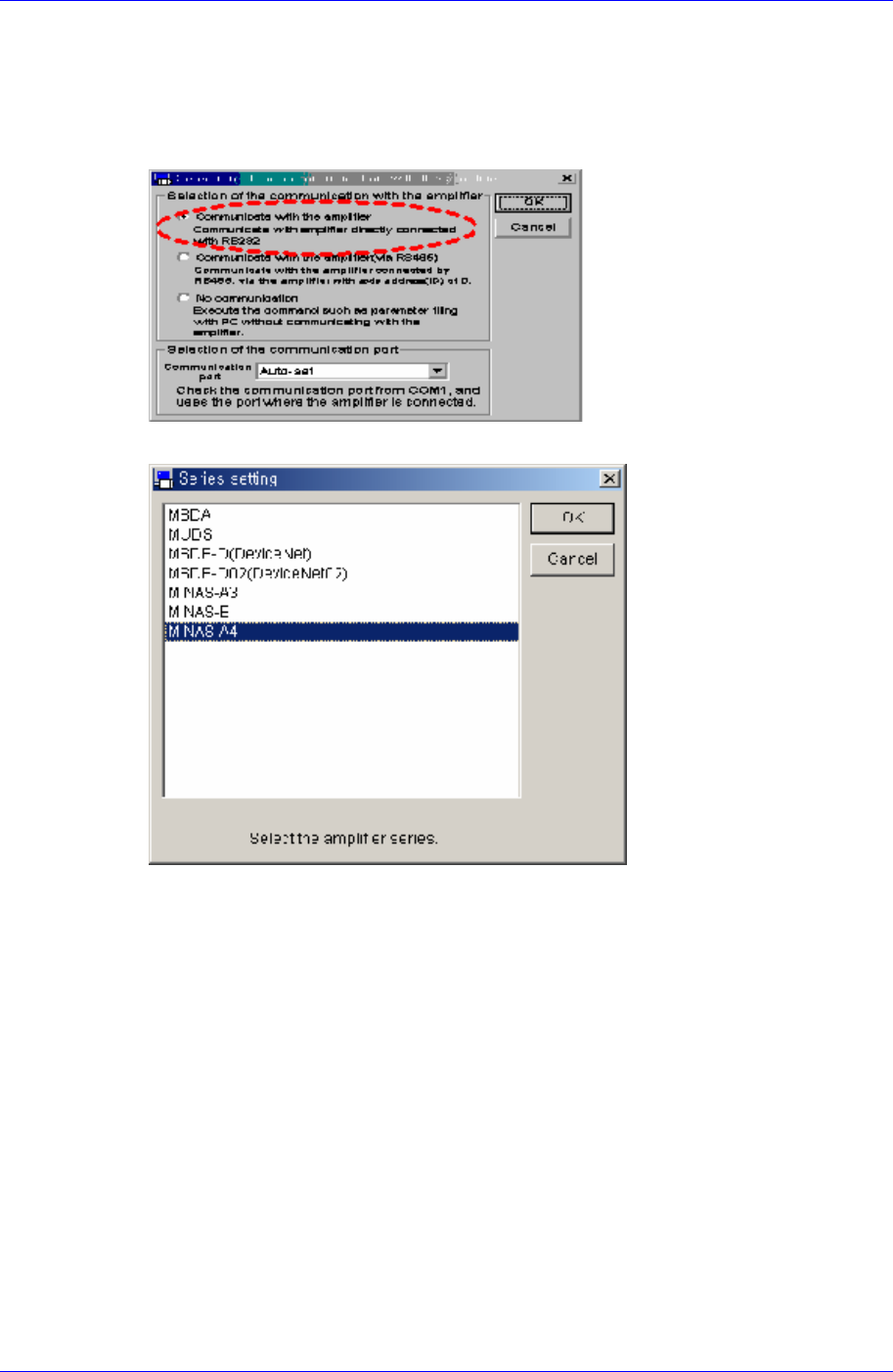 Motor Driver 14-9 14.2.4.3. Software 执行 1. 请执行 Co mputer 的 Panaterm Software 2. 执行 Panaterm Software 则显示如下画面,请选择 “Communicate with Amplifier directly connected with RS232” 部分后点击 <OK> 按钮。 3. 如下图显示 “Series Setting” ,…