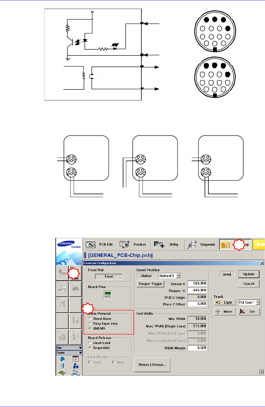 Samsung Component Placer SM421 Service Manual 2-18 IN OUT ① ② ③ ④ ① ② ③ ④ 출력 단 입력단 DC2 4V 〔 + 〕 ① ② ③ ④ DC 0 V 〔 - 〕 图 2-3 前后过程设备间的 Interface 邻接设备的 I/F Connector Cable 参照下图进行 连接。 U n it #1 U n it #2 U n it #3 ▶▶ PRE V …